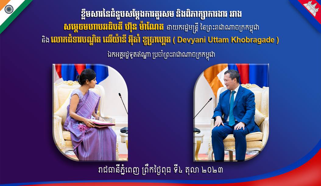 (ភ្នំពេញ)៖ ក្នុងជំនួបពិភាក្សាការងារជាមួយ លោកជំទាវ ដេវីយ៉ានី អ៊ុតាំ ខូប្រាហ្គេត (Devyani Uttam Khobragade) ឯកអគ្គរដ្ឋទូតឥណ្ឌា ប្រចាំនៅកម្ពុជា នាព្រឹកថ្ងៃទី៤ ខែតុលា ឆ្នាំ២០២៣ នៅវិមានសន្តិភាព សម្តេចមហាបវរធិបតី ហ៊ុន ម៉ាណែត នាយករដ្ឋមន្រ្តី នៃ កម្ពុជា បានលើកឡើងថា កិច្ចសហប្រតិបត្តិការកម្ពុជា-ឥណ្ឌា កំពុងស្ថិតនៅលើគន្លងមាគ៌ា នៃការអភិវឌ្ឍលូតលាស់ឥតឈប់ឈរ ។