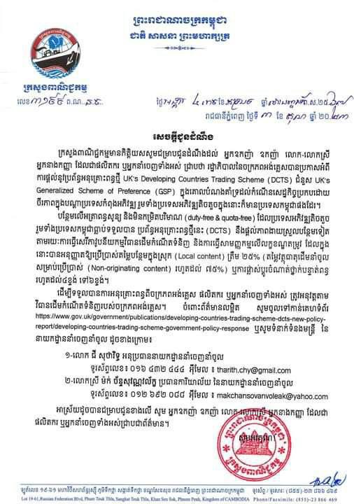 របស់ចក្រភពអង់គ្លេស។ ចំពោះព័ត៌មានលម្អិត សូមចូលទៅកាន់គេហទំព័រ ដើមកំណើតទំនិញ https://www.gov.uk/government/publications/developing-countries-trading-scheme-dcts-new-policy- report/developing-countries-trading-scheme-govemment-policy-response ឬសូមទំនាក់ទំនងមន្រ្តី នៃ នាយកដ្ឋាននាំចេញនាំចូល ដូចខាងក្រោម៖ ៕