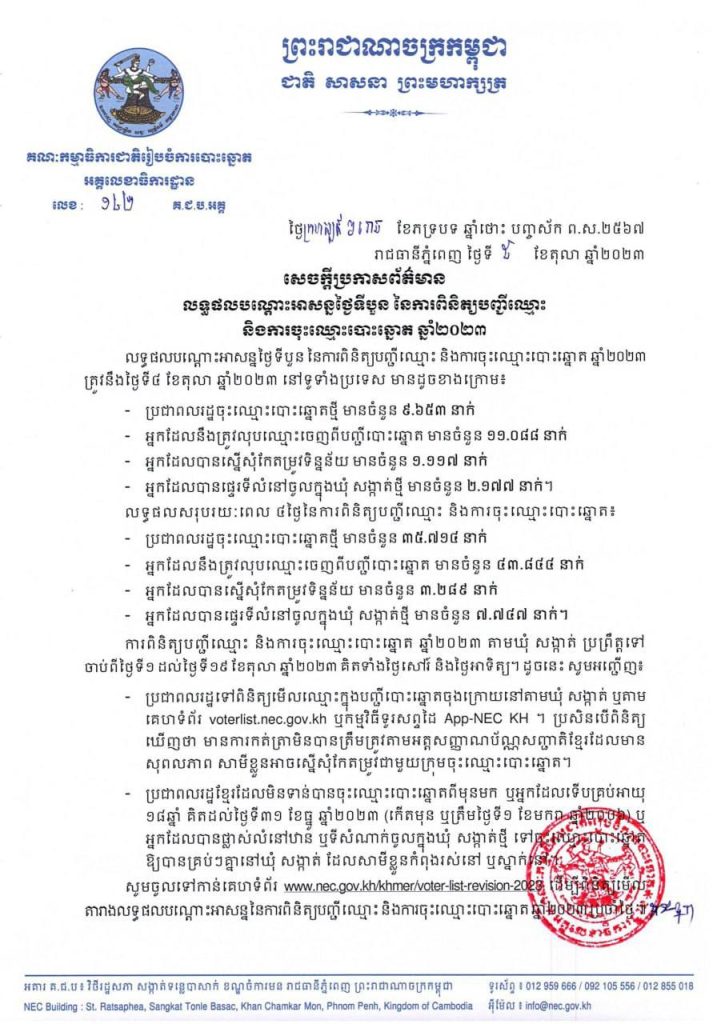 គ.ជ.ប ប្រកាសព័ត៌មានលទ្ធផលបណ្តោះអាសន្នថ្ងៃទីបួន នៃការពិនិត្យបញ្ជីឈ្មោះនិងការចុះឈ្មោះបោះឆ្នោត ឆ្នាំ២០២៣