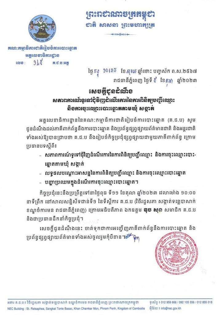 អគ្គលេខាធិការដ្ឋាននៃគណៈកម្មាធិការជាតិរៀបចំការបោះឆ្នោត (គជ.ប) សូម ជូនដំណឹងដល់ភាគីពាក់ព័ន្ធនឹងការបោះឆ្នោត និងប្រព័ន្ធផ្សព្វផ្សាយព័ត៌មានជាតិ និងអន្តរជាតិ ទាំងអស់ឱ្យបានជ្រាបថា គ.ជ.ប នឹងរៀបចំកិច្ចប្រជុំផ្សព្វផ្សាយជាមួយភាគីពាក់ព័ន្ធ ក្រោម ប្រធានបទស្តីពី៖