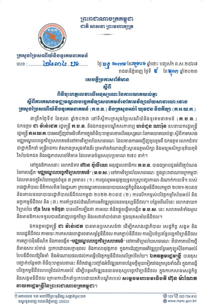 (ភ្នំពេញ)៖ ឯកឧត្ដម ជា វ៉ាន់ដេត រដ្ឋមន្ត្រីក្រសួងប្រៃសណីយ៍និងទូរគមនាគមន៍ និងឯកឧត្តមបណ្ឌិតសភាចារ្យ ហង់ជួន ណារ៉ុន ឧបនាយករដ្ឋមន្ត្រី រដ្ឋមន្ត្រីក្រសួងអប់រំយុវជននិងកីឡា កាលពីព្រឹថ្ងៃទី៩ ខែតុលា ឆ្នាំ២០២៣ នៅទីស្តីការក្រសួង បានអញ្ជើញជាអធិបតី ក្នុងពិធីចុះហត្ថលេខាលើអនុស្សរណៈនៃការយោគយល់គ្នា ស្ដីពីការកសាងមជ្ឈមណ្ឌលបច្ចេកវិទ្យាសហគមន៍នៅតាមវិទ្យាល័យសាធារណៈ ។