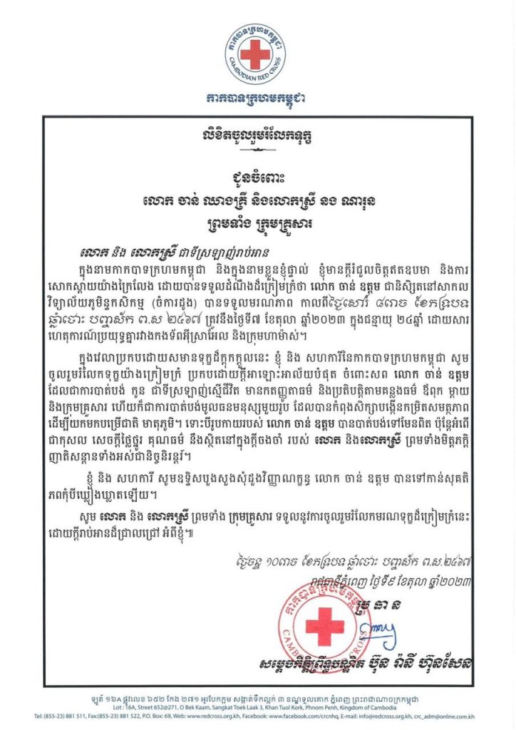 ស្ថិតក្នុងសមានទុក្ខដ៏ក្រៀមក្រំនោះ លោកជំទាវអគ្គលេខាធិការរងទី១ បានអាន និងប្រគល់ជូន ក្រុមគ្រួសារសព នូវសារលិខិតរំលែកមរណទុក្ខរបស់ សម្តេចកិត្តិព្រឹទ្ធបណ្ឌិត ប៊ុន រ៉ានី ហ៊ុនសែន ប្រធានកាកបាទក្រហមកម្ពុុជា ដែលក្នុងសារលិខិតនោះ សម្តេចកិត្តិព្រឹទ្ធបណ្ឌិត បានបញ្ជាក់ថា «ក្នុងវេលាប្រកបដោយសមានទុក្ខដ៏ក្តុកក្តួលនេះ ខ្ញុំ និងសហការីនៃកាកបាទក្រហមកម្ពុជា សូមចូលរួមរំលែកទុក្ខយ៉ាងក្រៀមក្រំ ប្រកបដោយក្តីអាឡោះអាល័យបំផុត ចំពោះសព លោក ចាន់ ឧត្តម ដែលជាការបាត់បង់កូនជាទីស្រឡាញ់ស្មើជីវិត មានកតញ្ញូតាធម៌ និងប្រតិបត្តិតាមគន្លងធម៌ ឪពុកម្តាយ និងក្រុមគ្រួសារ ហើយក៏ជាការបាត់បង់មូលធនមនុស្សមួយរូប ដែលបានកំពុងសិក្សាបង្កើនកម្រិតសមត្ថភាព ដើម្បីយកមកបម្រើជាតិមាតុភូមិ។