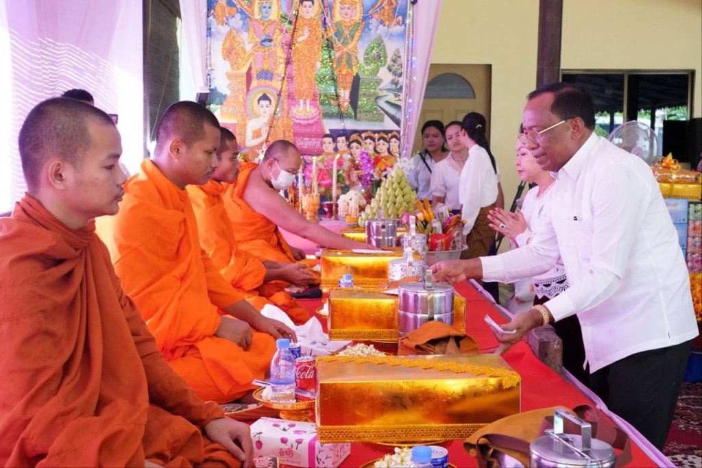 ឯកឧត្តម វង សូត្រ និងលោកជំទាវ ព្រមទាំងបុត្រ បានប្រគេនបច្ច័យដល់ព្រះចៅអធិការវត្ត ចំនួន ៥លានរៀល ទុកសម្រាប់កសាងសមិទ្ធិផលដែលបម្រើឱ្យវិស័យព្រះពុទ្ធសាសនា ដែលជាសាសនារបស់រដ្ឋ បានកាន់តែរីកទចំរើនរុងរឿង ជារៀងរហូត។ ជាមួយគ្នានេះ បានប្រគេនបច្ច័យ សម្រាប់ព្រះសង្ឃ៧អង្គ ក្នុង១អង្គៗ សាដក១ និងបច្ច័យ ១០ម៉ឺនរៀល ។ យាយជី តាជី និងបងប្អូនប្រជាពលរដ្ឋចំនួន ៥០០នាក់ បានរៀបចំអាហារសាមគ្គី១ពេល និងក្នុងម្នាក់ៗ ទទួលបានប្រេងកូឡា១ខ្លង ក្រម៉ា១ និងថវិកា ៥ម៉ឺនរៀល។