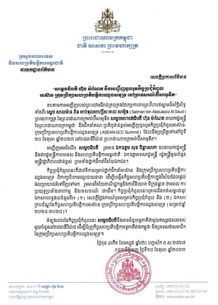 ភ្នំពេញ៖ តបតាមការអញ្ជើញរបស់ព្រះចៅអធិរាជគ្រប់គ្រងថែរក្សាការពារព្រះវិហារឥស្លាមដ៏ស័ក្តិសិទ្ធទាំងពីរ ស្តេច សាលម៉ាន ពិន អាប់ឌុលអាហ្ស៊ីស អាល សាអ៊ូឌ (Salman bin Abdulaziz Al Saud) ព្រះមហាក្សត្រ នៃព្រះរាជាណាចក្រអារ៉ាប៊ីសាអូឌីត សម្ដេចមហាបវរធិបតី ហ៊ុន ម៉ាណែត នាយករដ្ឋមន្ត្រី នៃព្រះរាជាណាចក្រកម្ពុជា នឹងដឹកនាំគណៈប្រតិភូជាន់ខ្ពស់អញ្ជើញចូលរួមកិច្ចប្រជុំកំពូលអាស៊ានក្រុមប្រឹក្សាសហប្រតិបត្តិការឈូងសមុទ្រ (ASEAN-GCC Summit) ដែលនឹងប្រព្រឹត្តទៅនៅថ្ងៃទី២០ ខែតុលា ឆ្នាំ២០២៣ នៅរាជធានីរីយ៉ាដ ព្រះរាជាណាចក្រអារ៉ាប៊ីសាអូឌីត។ នេះបើយោងតាមសេចក្តីប្រកាសព័ត៌មានរបស់ក្រសួងការបរទេស និងសហប្រតិបត្តិការអន្តរជាតិ នៅថ្ងៃទី១៨ ខែតុលា ឆ្នាំ២០២៣។