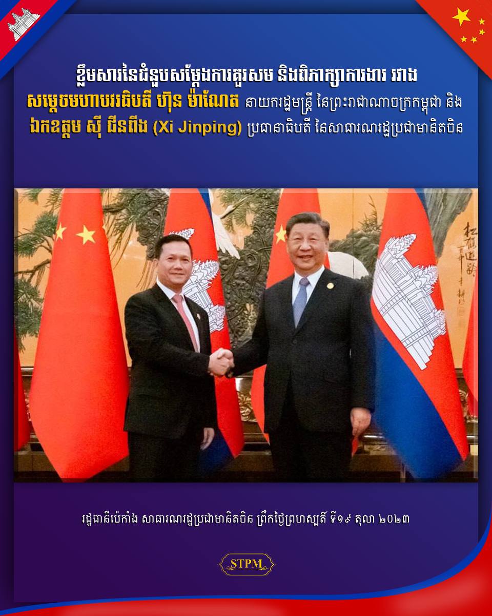 នេះបើតាមលទ្ធផលនៃជំនួបពិភាក្សាការងាររវាង សម្តេចមហាបវរធិបតី ហ៊ុន ម៉ាណែត នាយករដ្ឋមន្រ្តី នៃកម្ពុជា ជាមួយ ឯកឧត្តម ស៊ី ជីនពីង ប្រធានាធិបតី នៃសាធារណរដ្ឋប្រជាប្រជាមានិតចិន នាព្រឹកថ្ងៃទី១៩ ខែតុលា ឆ្នាំ២០២៣ ក្នុងឱកាសនៃការចូលរួមក្នុង “វេទិកាខ្សែក្រវាត់ និងផ្លូវ លើកទី៣” នៅរដ្ឋធានីប៉េកាំង ។