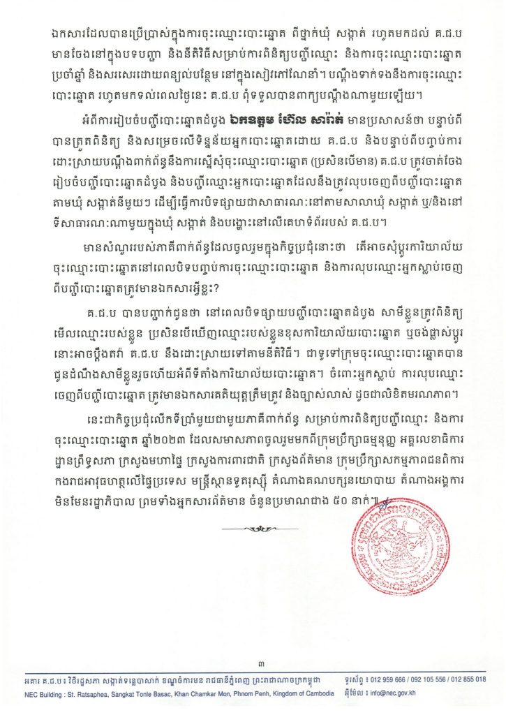 គណៈកម្មាធិការជាតិរៀបចំការបោះឆ្នោត (គ.ជ.ប) បានបើកកិច្ចប្រជុំជាមួយភាគីពាក់ព័ន្ធនឹងការបោះឆ្នោត នៅថ្ងៃទី១៩ ខែតុលា ឆ្នាំ២០២៣ ក្រោមអធិបតីភាពរបស់ ឯកឧត្ដម ហ៊ែល សារ៉ាត់ សមាជិក គ.ជ.ប និងជាប្រធានដឹកនាំកិច្ចប្រជុំ ដើម្បីផ្សព្វផ្សាយអំពីការបិទបញ្ចប់ដំណើរការចុះឈ្មោះបោះឆ្នោតនៅតាមឃុំ សង្កាត់ សម្រាប់ការពិនិត្យបញ្ជីឈ្មោះ និងការចុះឈ្មោះបោះឆ្នោត ឆ្នាំ២០២៣។ ឯកឧត្ដម ហ៊ែល សារ៉ាត់ មានប្រសាសន៍ថា កិច្ចប្រជុំផ្សព្វផ្សាយជាមួយភាគីពាក់ព័ន្ធថ្ងៃនេះ ដើម្បីធ្វើបច្ចុប្បន្នភាព និងជូនព័ត៌មានមួយចំនួនពាក់ព័ន្ធនឹងដំណើរការពិនិត្យបញ្ជីឈ្មោះ និងការចុះឈ្មោះបោះឆ្នោត តាមឃុំ សង្កាត់ ឆ្នាំ២០២៣ ដែលបានចាប់ផ្តើមអនុវត្តពីថ្ងៃទី១ រហូតមកដល់ថ្ងៃទី១៩ ខែតុលា ឆ្នាំ២០២៣។ ដំណើរការពិនិត្យបញ្ជីឈ្មោះ និងចុះឈ្មោះបោះឆ្នោតនៅតាមឃុំ សង្កាត់ កន្លងមកនេះ បើទោះបីមានបញ្ហាអាកាសធាតុ ដោយតំបន់ខ្លះមានភ្លៀងធ្លាក់ខ្លាំងជំនន់ហើយ ភូមិសាស្ត្រមួយចំនួនក្នុងឃុំ សង្កាត់ស្ថិតនៅឆ្ងាយដាច់ពីគ្នា និងមានភាពខ្វះខាតតិចតួចបានកើតឡើងក្នុងការអនុវត្តភារកិច្ចរបស់ក្រុមចុះឈ្មោះបោះឆ្នោត (ក.ច.ប) ប៉ុន្តែមិនមែនជាឧបសគ្គធ្វើឱ្យរាំងស្ទះដល់ដំណើរការពិនិត្យបញ្ជីឈ្មោះ និងចុះឈ្មោះបោះឆ្នោតនោះឡើយ។
