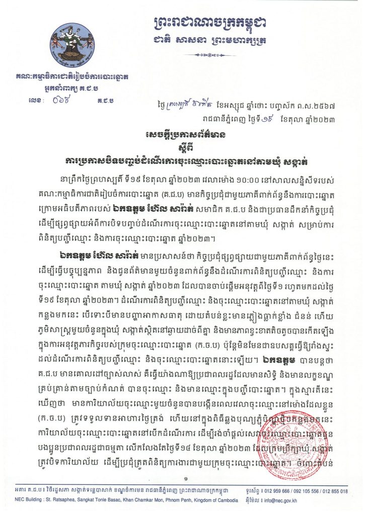 គ.ជ.ប ប្រកាសបិទបញ្ចប់ដំណើរការពិនិត្យបញ្ជីឈ្មោះ និងការចុះឈ្មោះបោះឆ្នោត ឆ្នាំ២០២៣