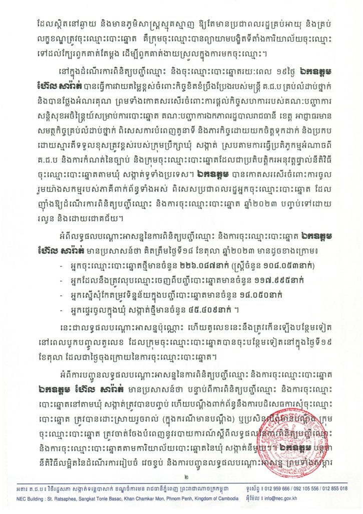 អំពីលទ្ធផលបណ្តោះអាសន្ននៃការពិនិត្យបញ្ជីឈ្មោះ និងការចុះឈ្មោះបោះឆ្នោត ឯកឧត្ដម ហ៊ែល សារ៉ាត់ មានប្រសាសន៍ថា គិតត្រឹមថ្ងៃទី១៨ ខែតុលា ឆ្នាំ២០២៣ មានដូចខាងក្រោម៖