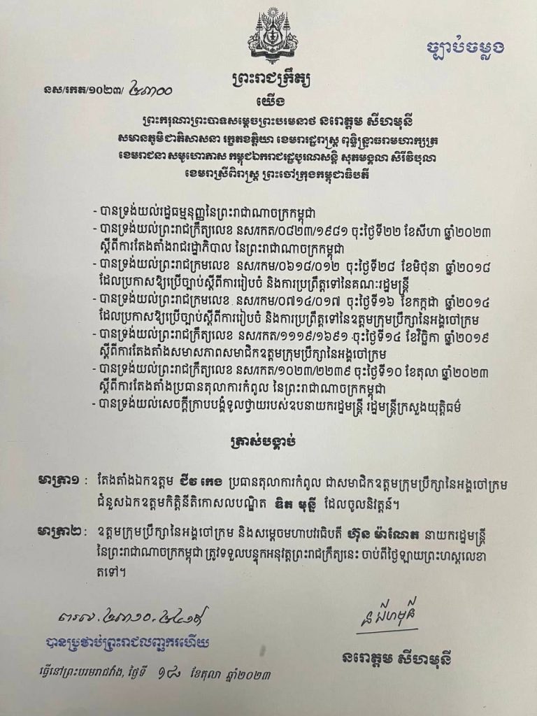 ព្រះមហាក្សត្រ ចេញព្រះរាជក្រឹត្យតែងតាំងលោក ជីវ កេង ជាសមាជិកឧត្តមក្រុមប្រឹក្សានៃអង្គចៅក្រម ជំនួសលោក ឌិត មុន្ទី ដែលចូលនិវត្តន៍One-Minuteព័ត៌មានជាតិអត្ថបទដោយ៖AMS OneMinute ១៨ តុលា ២០២៣ #ams1minute AMS OneMinuteអត្ថបទមុនអត្ថបទបន្ទាប់