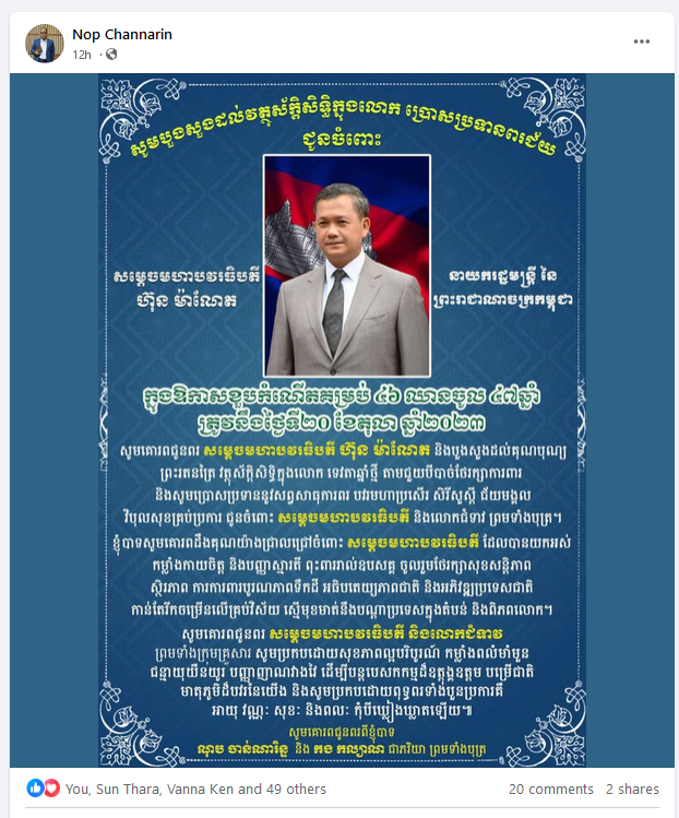 ឯកឧត្តម ណុប ចាន់ណារិន្ទ និងលោកជំទាវគោរពជូនពរ សម្តេចមហាបវរធិបតី ហ៊ុន ម៉ាណែត ក្នុងឱកាសខួប កំណើតគម្រប់ ៤៦ ឈានចូល ៤៧ឆ្នាំ