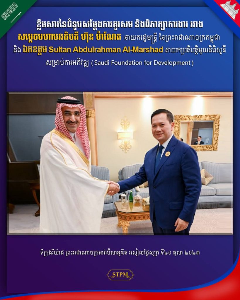 ភ្នំពេញ៖ថ្នាក់ដឹកនាំមូលនិធិសូឌី សម្រាប់ការអភិវឌ្ឍរបស់អារ៉ាប៊ី សាអូឌីត បានបញ្ជាក់ពីការគាំទ្រគម្រោងនៃការផ្តល់ហិរញ្ញប្បទាន ដល់កម្ពុជា សម្រាប់អភិវឌ្ឍវិស័យកសិកម្ម និងកសាងហេដ្ឋារចនា សម្ព័ន្ធរូបវ័ន្ត ។នេះបើតាមលទ្ធផលនៃជំនួបពិភាក្សា ការងាររវាង សម្តេចមហាបវរធិបតី ហ៊ុន ម៉ាណែត នាយករដ្ឋមន្រ្តី នៃព្រះរាជា ណាចក្រកម្ពុជា ជាមួយ ឯកឧត្តម Sultan Abdulrahman Al-Marshad នាយកប្រតិបត្តិ នៃមូលនិធិសូឌីសម្រាប់ការអភិវឌ្ឍ (Saudi Fund for Development – SFD) ក្នុងឱកាសឯកឧត្តម ចូលជួប សម្តែងការគួរសម និងពិភាក្សាការងារ ក្នុងឱកាសនៃការចូលរួមក្នុង “កិច្ចប្រជុំកំពូលអាស៊ាន-ក្រុមប្រឹក្សាសហប្រតិបត្តិការឈូងសមុទ្រ” នៅទីក្រុងរីយ៉ាដ ព្រះរាជាណាចក្រអារ៉ាប៊ីសាអូឌីត នារសៀលថ្ងៃទី២០ ខែតុលា ឆ្នាំ២០២៣ ។