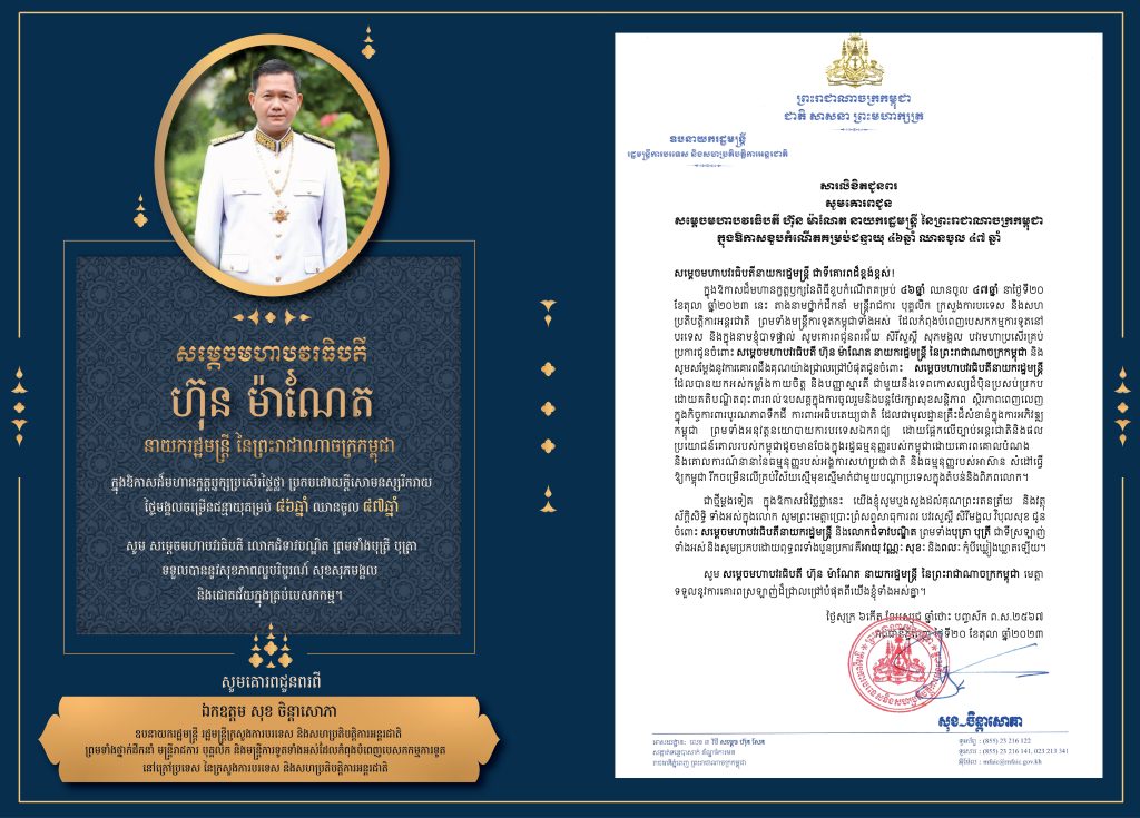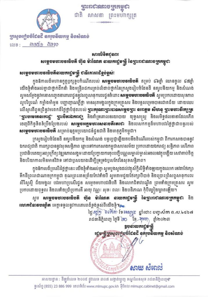 មន្ត្រីរាជការ ក្រសួងរៀបចំដែនដី នគរូបនីយកម្ម និងសំណង់ ផ្ញើសារលិខិត ជូនពរ សម្តេចមហាបវរធិបតី ហ៊ុន ម៉ាណែត ក្នុងឱកាសខួបកំណើតគម្រប់ជន្មាយុ ៤៦ឆ្នាំ ឈានចូល ៤៧ឆ្នាំ