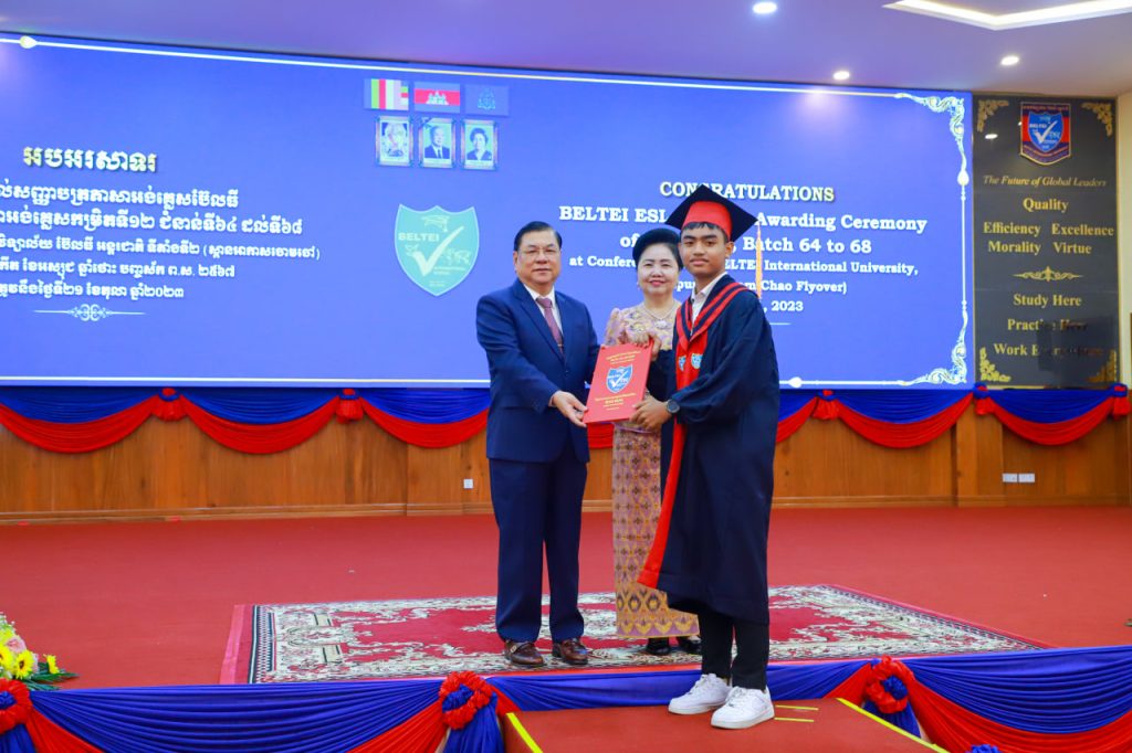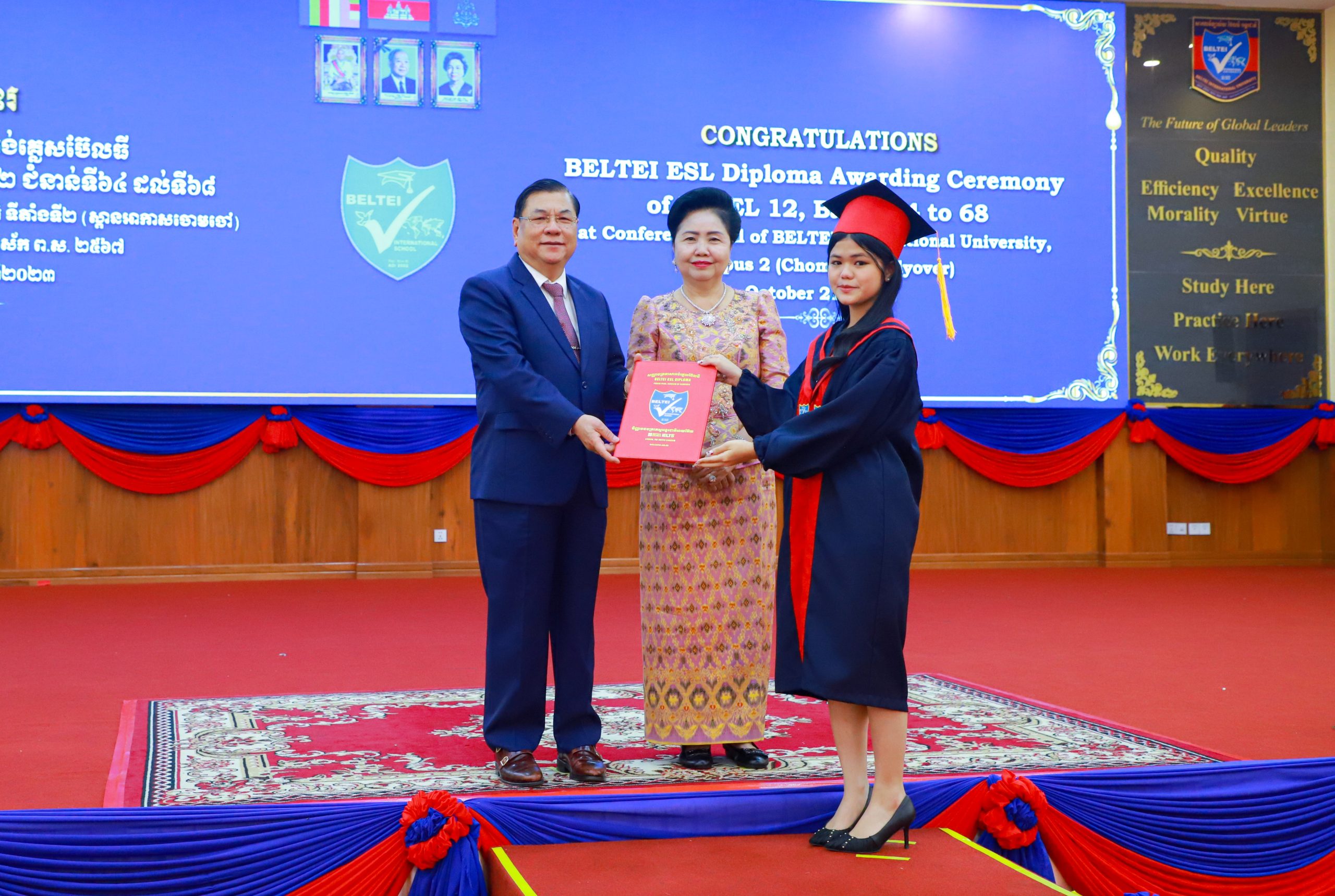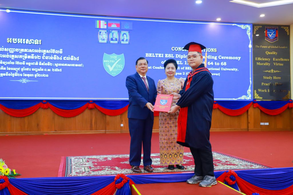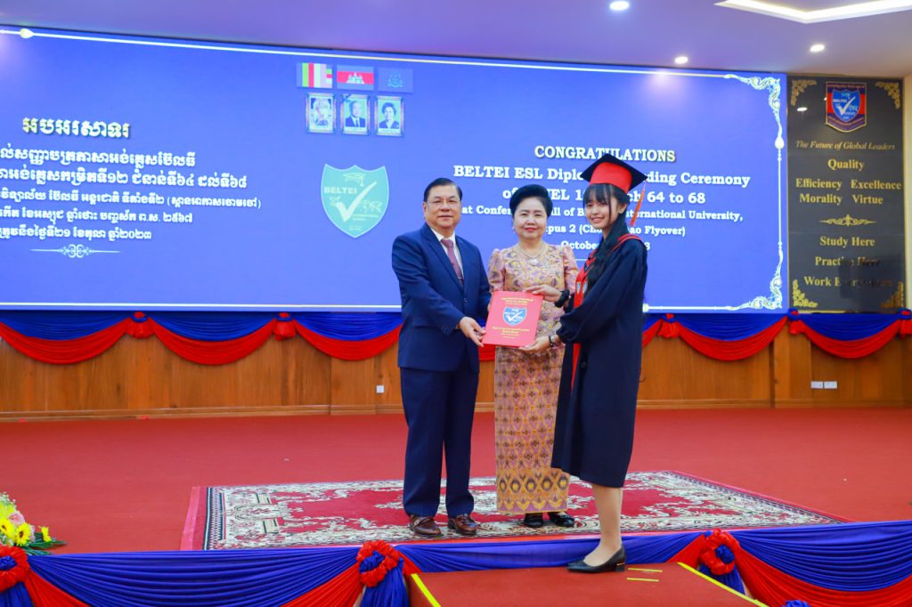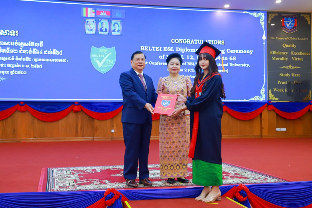 ភ្នំពេញ៖ ព្រឹកថ្ងៃទី២១ ខែតុលា ឆ្នាំ២០២៣ សាលា ប៊ែលធី អន្តរជាតិ បានប្រារព្ធពិធីប្រគល់សញ្ញាបត្រភាសាអង់គ្លេសប៊ែលធី ជូនដល់សិស្សថ្នាក់ភាសាអង់គ្លេសទូទៅ កម្រិត១២ (Level 12) ជំនាន់ទី៦៤ ដល់ទី៦៨ ដែលបានប្រឡងជាប់សញ្ញាបត្រ ភាសាអង់គ្លេសប៊ែលធី (BELTEI ESL DIPLOMA) ចំនួន ១,០២២នាក់ ក្រោមអធិបតីភាពដ៏ខ្ពង់ខ្ពស់ ឯកឧត្តមបណ្ឌិត លី ឆេង តំណាងរាស្រ្តមណ្ឌលរាជធានីភ្នំពេញ ស្ថាបនិក និងជាអគ្គនាយក ប៊ែលធី គ្រុប និង លោកជំទាវ ដែលបាន ប្រព្រឹត្តទៅនៅសាលសន្និសីទនៃសាកលវិទ្យាល័យ ប៊ែលធី អន្តរជាតិ ទី២ (ស្ពានអាកាសចោមចៅ)។