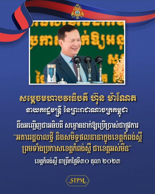 ភ្នំពេញ៖ ខេត្តកំពង់ស្ពឺនឹងត្រូវបានប្រកាសជាខេត្តអស់មីនទី១៣នៅថ្ងៃទី ៣០ ខែតុលា ឆ្នាំ២០២៣ក្នុងឱកាសសម្ពោធអគាររដ្ឋបាលថ្មីនិងសមិទ្ធផលនានាក្នុងខេត្តកំពង់ស្ពឺក្រោមអធិបតីភាពដ៏ខ្ពង់ខ្ពស់សម្ដេចមហាបវរធិបតី ហ៊ុន ម៉ាណែត នាយករដ្ឋមន្រ្តីកម្ពុជា។