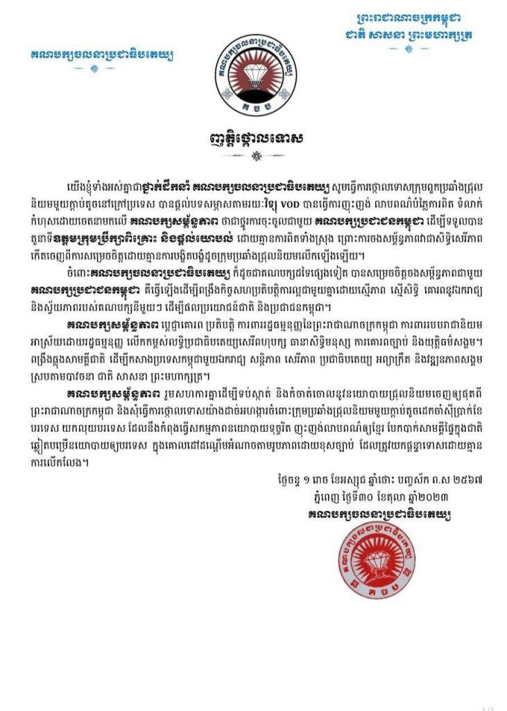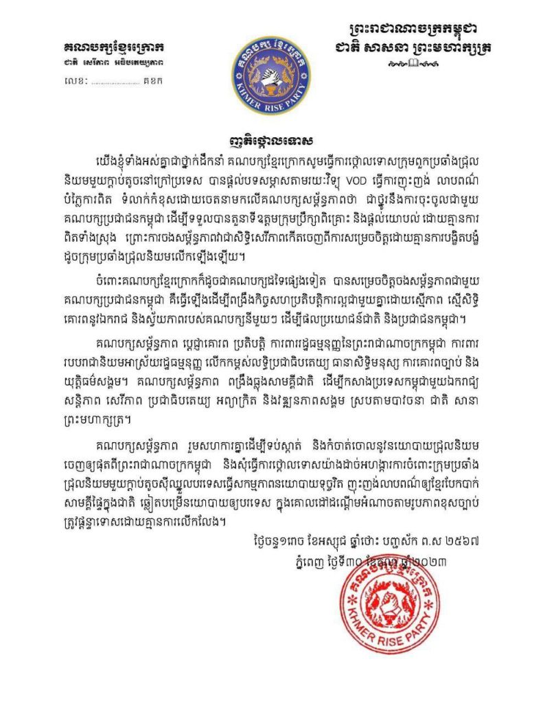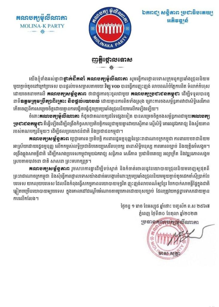 ភ្នំពេញ៖ គណបក្សមហាសាមគ្គីជាតិខ្មែរ គណបក្សចលនាប្រជាធិបតេយ្យ គណបក្សកម្ពុជាសេរីឯករាជ្យប្រជាធិបតេយ្យ គណបក្សម៉ូលីណាកា គណបក្សខ្មែរអភិរក្ស គណបក្សខ្មែរក្រោក និងគណបក្សកម្លាំងប្រជាធិបតេយ្យ បានធ្វើការថ្កោលទោសក្រុមពួកប្រឆាំងជ្រុលនិយមមួយក្ដាប់តូចនៅក្រៅប្រទេស បានផ្តល់បទសម្ភាសតាមរយៈវិទ្យុ VOD បានធ្វើការញុះញង់ លាបពណ៌បំភ្លៃការពិត ទម្លាក់កំហុសដោយចេតនាមកលើគណបក្សសម្ព័ន្ធភាពថាជាថ្នូរការចុះចូលជាមួយគណបក្សប្រជាជនកម្ពុជា ដើម្បីទទួលបានតួនាទីឧត្តមក្រុមប្រឹក្សាពិគ្រោះ និងផ្តល់យោបល់ ដោយគ្មានការពិតទាំងស្រុង ព្រោះការចងសម្ព័ន្ធភាពវាជាសិទ្ធិសេរីភាព កើតចេញពីការសម្រេចចិត្តដោយគ្មានការបង្ខិតបង្ខំដូចក្រុមប្រឆាំងជ្រុលនិយមលើកឡើងឡើយ។