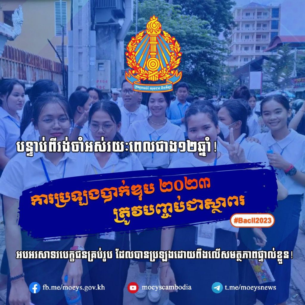 ក្រសួងអប់រំ យុវជន និងកីឡាបានសរសេរលើ ទំព័រហ្វេសប៊ុក ផ្លូវការ ដោយ បានបញ្ជាក់ថា”បន្ទាប់ពីរង់ចាំរយៈពេល១២ឆ្នាំ! ការប្រឡងបាក់ ឌុប ២០២៣ ត្រូវបញ្ចប់ជាស្ថាពរ អបអរសាទរបេក្ខជនគ្រប់រូប ដែលបានប្រឡងដោយពឹងលើសមត្ថភាពផ្ទាល់ខ្លួន!”។