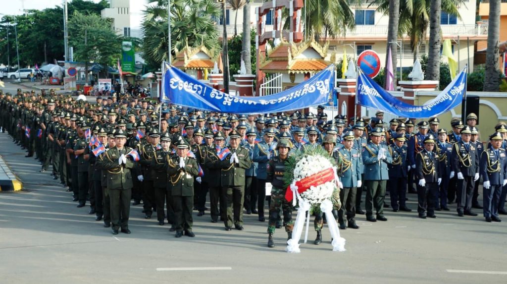ឯកឧត្តមអភិបាលខេត្ត បន្តថា ទន្ទឹមនឹងបុណ្យខួបអនុស្សាវរីយ៍លើកទី៧០ នៃទិវាបុណ្យឯករាជ្យជាតិ ថ្ងៃនេះយើងទាំងអស់គ្នាក៍សូមចូលរួមអបអរសាទរទិវាកំណើត នៃកងយោធពលខេមរភូមិន្ទ ឆ្នាំ២០២៣ ដ៍អង់អាចក្លាហាន របស់យើងដែលព្រះករុណាព្រះបាទសម្តេច នរោត្តម សីហនុ ព្រះបរមរតនកោដ្ឋ បានបង្កើតឡើង ហើយដែលកន្លងមក ក៍ដូចជាបច្ចុប្បន្ន កំពុងតែបំពេញភារកិច្ចដ៏ឧត្តុងឧត្តម របស់ខ្លួន ក្នុងការថែរក្សា ការពារសេចក្តីសុខក្សេមក្សាន្តជូនប្រជាពលរដ្ឋ និងការពារបូរណភាពទឹកដីដែលជាមរតក ដ៍ពិសិដ្ឋពុំឱ្យអ្នកណា ឈ្លាន ពានបានឡើយ ។