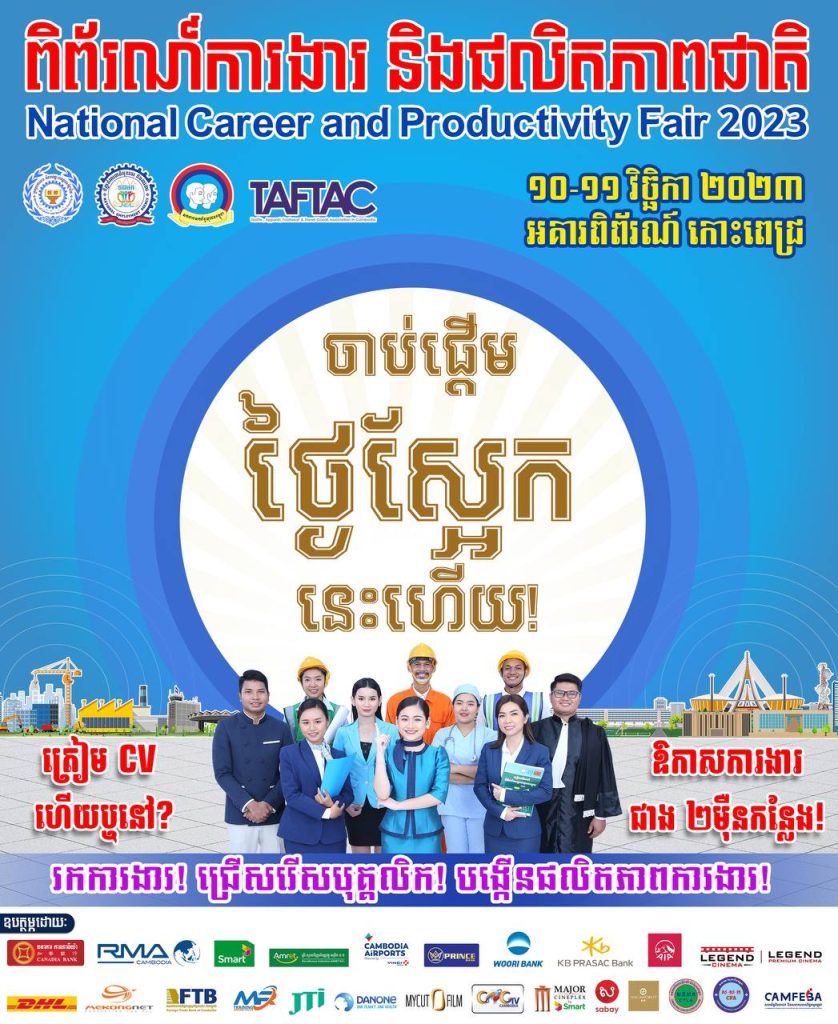 (ភ្នំពេញ)៖ឱកាសការងារ ជាង ២០ ០០០កន្លែង ពីក្រុមហ៊ុន រោងចក្រ និងសហគ្រាសធំៗ ១៥០ នឹងផ្តល់ដល់យុវជន សិស្ស/និស្សិត និងអ្នកស្វែងរកការងារធ្វើ នៅក្នុងមហាព្រឹត្តិការណ៍ការងារ ធំជាងគេប្រចាំឆ្នាំ គឺ”ពិព័រណ៍ការងារ និងផលិតភាពជាតិ” រយៈពេល ពីរថ្ងៃជាប់គ្នាគឺថ្ងៃទី១០-១១ ខែវិច្ឆិកា នៅអគារពិព័រណ៍កោះពេជ្រ ចាប់ពីម៉ោង ៨ព្រឹក ដល់ ៨យប់។