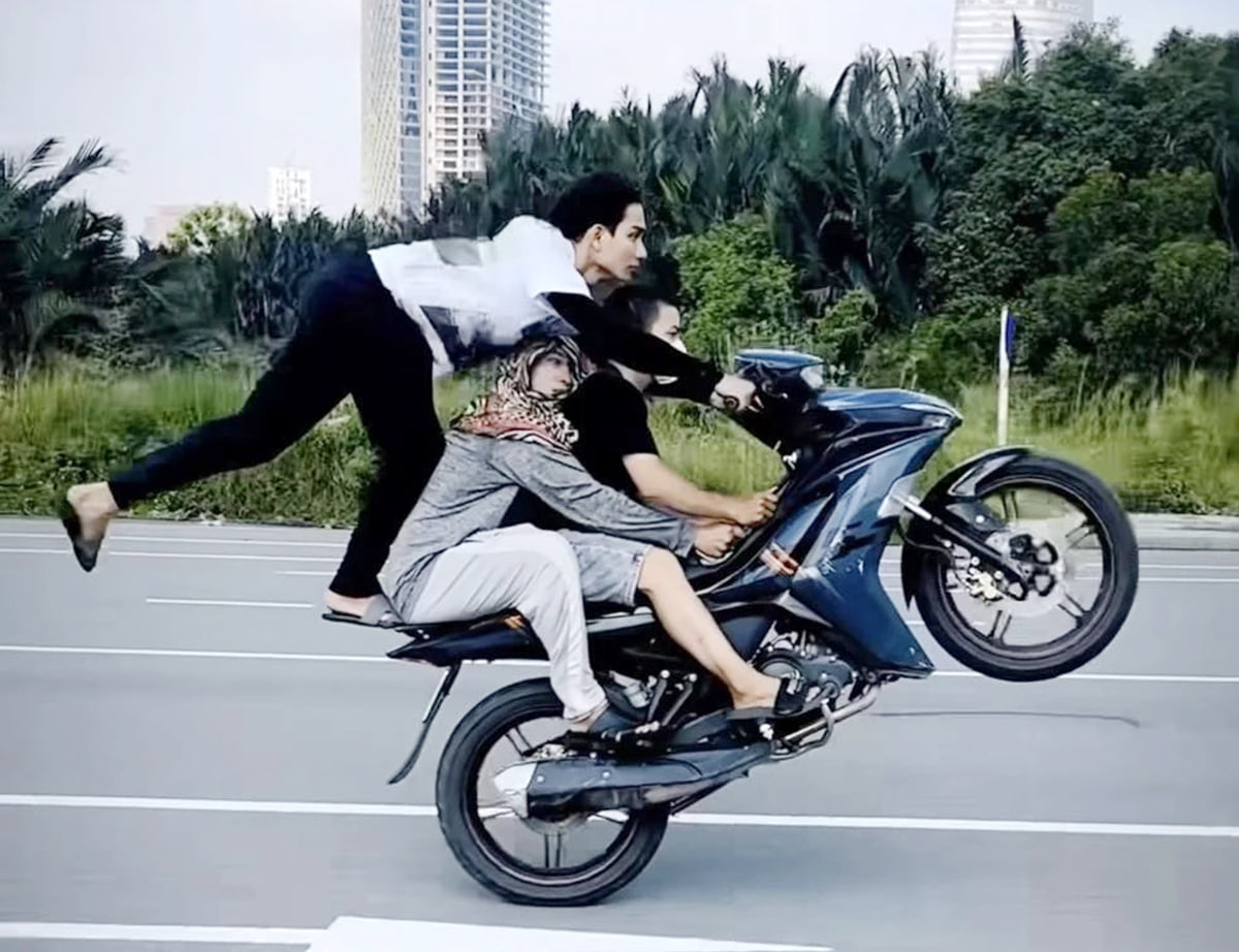 ក្នុងវិដេអូដែលចែកចាយលើបណ្ដាញសង្គម អ្នកទាំងបីជិះម៉ូតូតែមួយ ហើយគ្មាននរណាម្នាក់ពាក់មួកសុវត្ថិភាពនោះទេ ដោយជួនកាលពួកគេបង្ហោះកង់មុខ ជួនកាលព្រលែងចង្កូត ហើយជួនកាលអ្នកបើកបញ្ឈរខ្លួន ទុកតែដៃជាប់ចង្កូតជាដើម។
