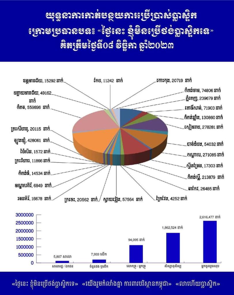 យុទ្ធនាការកាត់បន្ថយប្រើប្រាស់ប្លាស្ទិក គិតមកដល់ ថ្ងៃទី០៨ ខែវិច្ឆិកា មានអ្នកចូលរួមសរុបជាង ២លាន៦សែននាក់