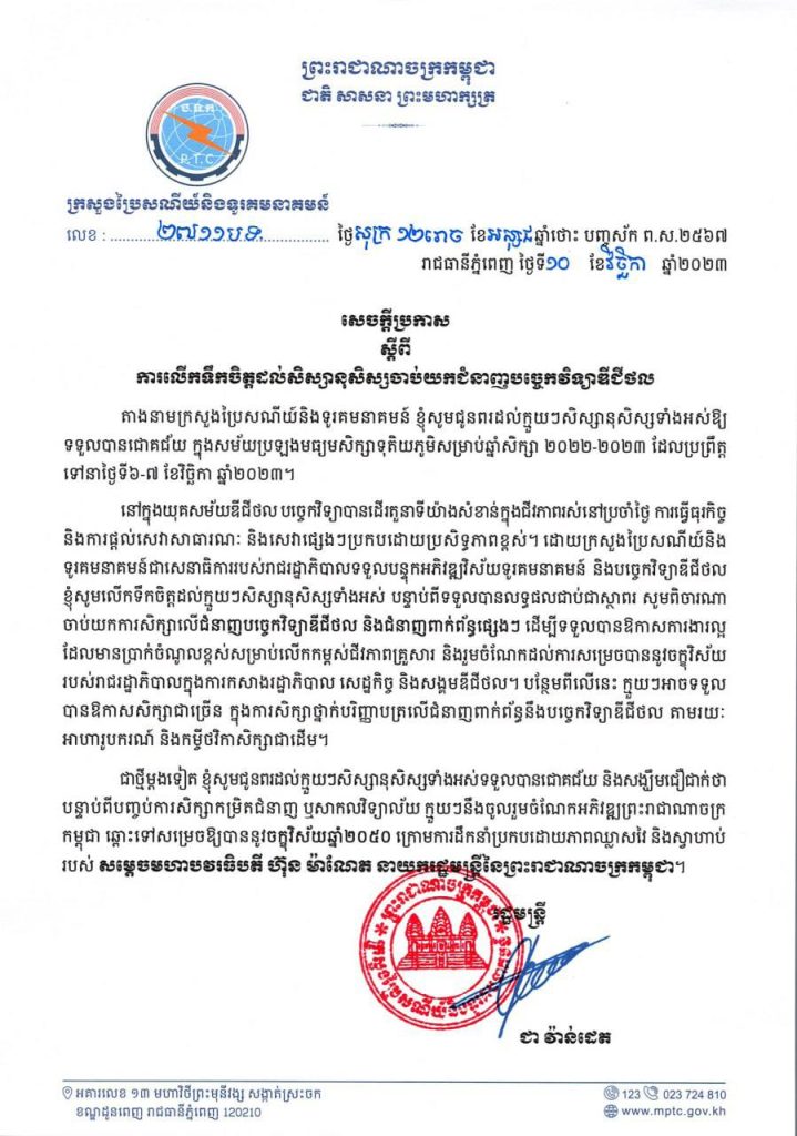 ឯកឧត្តមរដ្ឋមន្រ្តី ជា វ៉ាន់ដេត បានលើកឡើងបន្ថែមថា ក្នុងនាមជា សេនាធិការ របស់រាជរដ្ឋាភិបាលទទួលបន្ទុកអភិវឌ្ឍវិស័យ ទូរគមនា គមន៍ និងបច្ចេកវិទ្យាឌីជីថល ក្រសួងលើកទឹកចិត្តដល់ក្មួយៗសិស្សា នុសិស្សទាំងអស់ បន្ទាប់ពីទទួលបានលទ្ធផលជាប់ជាស្ថាពរ សូម ពិចារណាចាប់យកការសិក្សាលើជំនាញបច្ចេកវិទ្យាឌីជីថល និង ជំនាញពាក់ព័ន្ធផ្សេងៗ ដើម្បីទទួលបានឱកាសការងារល្អ ដែលមាន ប្រាក់ចំណូលខ្ពស់សម្រាប់លើកកម្ពស់ជីវភាពគ្រួសារ និងរួមចំណែក ដល់ការសម្រេចបាននូវចក្ខុវិស័យរបស់រាជរដ្ឋាភិបាលក្នុងការកសាងរដ្ឋាភិបាល សេដ្ឋកិច្ច និងសង្គមឌីជីថល។ បន្ថែមពីលើនេះ ក្មួយៗអាច ទទួលបានឱកាសសិក្សាជាច្រើន ក្នុងការសិក្សាថ្នាក់បរិញ្ញាបត្រ លើ ជំនាញ ពាក់ព័ន្ធនឹងបច្ចេកវិទ្យាឌីជីថល តាមរយៈអាហារូបករណ៍ និង កម្ចីថវិកាសិក្សាជាដើម។