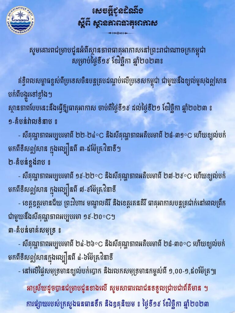 ក្រសួងធនធានទឹកបញ្ជាក់ថា ៖ «នៅតំបន់ខ្ពង់រាបរួមមាន ខេត្តឧត្តរមានជ័យ ព្រះវិហារ មណ្ឌលគិរី និងខេត្តរតនគិរី ធាតុអាកាសបន្តត្រជាក់នៅពេលព្រឹក ជាមួយនឹងសីតុណ្ហភាពអប្បបរមា ១៩-២០អង្សាសេ។ ចំណែកតំបន់មាត់សមុទ្រ នៅលើផ្ទៃសមុទ្រមានខ្យល់បក់បោក និងរលកសមុទ្រមានកម្ពស់ពី ១,០០-១,៥០ម៉ែត្រ»៕