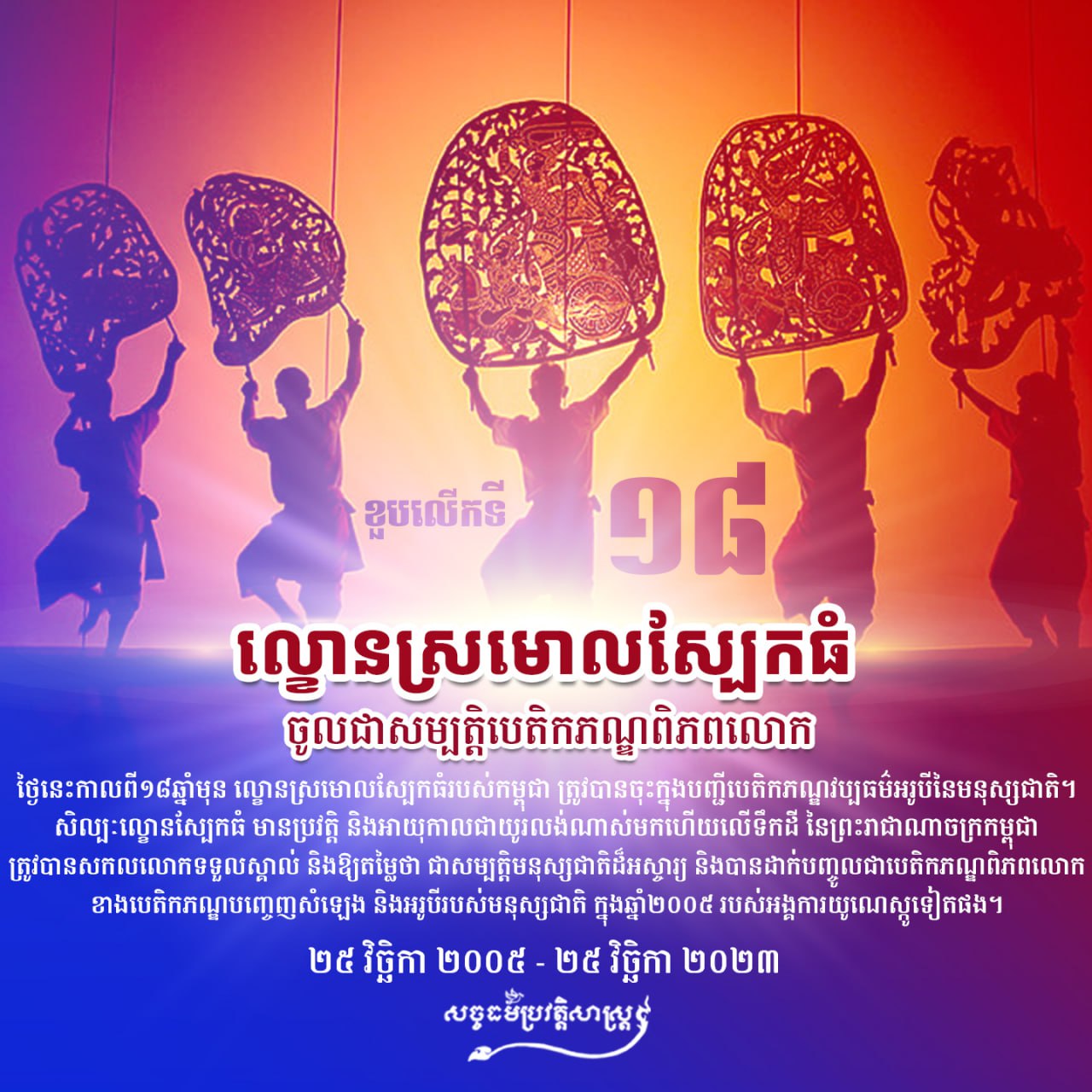 ខួបលើកទី១៨ ល្ខោនស្រមោលស្បែកធំ ចូលជាសម្បត្តិបេតិកភណ្ឌពិភពលោកដំណើររបស់កម្ពុជាសច្ចធម៌ប្រវត្តិសាស្ត្រអត្ថបទដោយ៖លី ប៊ុនហេង - Ly Bunheng #សច្ចធម៌ប្រវត្ដិសាស្រ្ដ #ព្រះរាជាណាចក្រកម្ពុជា #ខួបទី១៨ #ល្ខោនស្រមោលស្បែកធំ #បេតិកភណ្ឌពីភពលោក #វប្បធម៌អរូបីនៃមនុស្សជាតិ Facebook Page: សច្ចធម៌ប្រវត្ដិសាស្រ្ដTo all social media លី ប៊ុនហេង - Ly Bunhengលី ប៊ុនហេង ប្រធានផ្នែកផ្សព្វផ្សាយ នៃសច្ចធម៌ប្រវត្តិសាស្រ្ដអត្ថបទមុនអត្ថបទបន្ទាប់