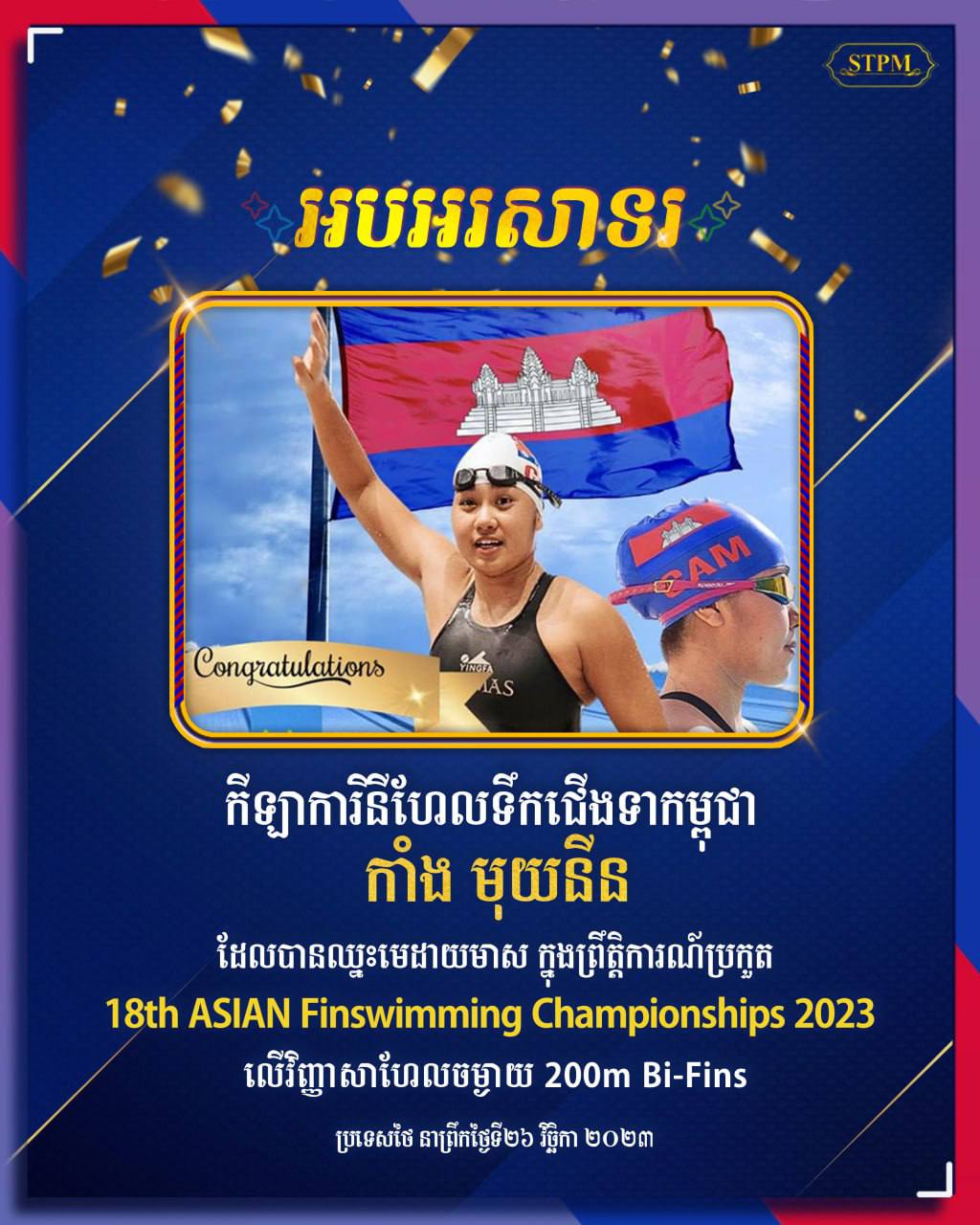 ភ្នំពេញ៖ សម្ដេចមហាបវរធិបតី ហ៊ុន ម៉ាណែត នាយករដ្ឋមន្ត្រី នៃព្រះរាជាណាចក្រកម្ពុជា តាមរយៈបណ្ដាញសង្គមតេលេក្រាម នៅព្រឹកថ្ងៃទី២៧ ខែវិច្ឆិកា ឆ្នាំ២០២៣ បានប្រកាសអបអរសាទរ កីឡាការិនីហែលទឹកជើងទាកម្ពុជា កាំង មុយនីន ដែលបានឈ្នះមេដាយមាស លើវិញ្ញាសាហែលចម្ងាយ 200m Bi-Fins ។