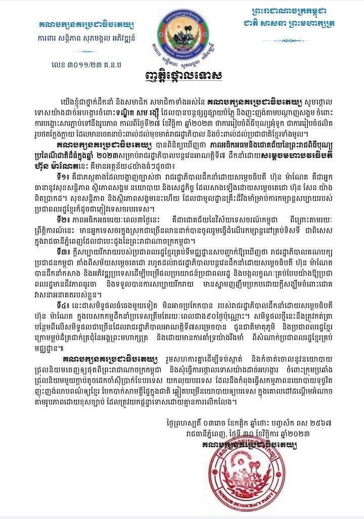 គណបក្សនគរបជាធិបតេយ្យ រួមសហការគ្នាដើម្បីទប់ស្កាត់ និងកម្ចាត់ចោលនូវនយោបាយជ្រុលនិយមចេញឱ្យផុតពីព្រះរាជាណាចក្រកម្ពុជា និងសុំធ្វើការថ្កោលទោសយ៉ាងដាច់អហង្ការចំពោះក្រុមប្រឆាំងជ្រុលនិយមមួយក្ដាប់តូចដេកចាំស៊ីប្រាក់ខែបរទេស យកលុយបរទេស ដែលនឹងកំពុងធ្វើសកម្មភាពនយោបាយទុច្ចរិត ញុះញង់លាបពណ៌ឱ្យខ្មែរ បែកបាក់សាមគ្គីផ្ទៃក្នុងជាតិ ឆ្លៀតបម្រើនយោបាយឱ្យបរទេស ក្នុងគោលដៅដណ្ដើមអំណាច តាមរូបភាពដោយខុសច្បាប់ ដែលត្រូវយកផ្តន្ទាទោសដោយគ្មានការលើកលែង៕