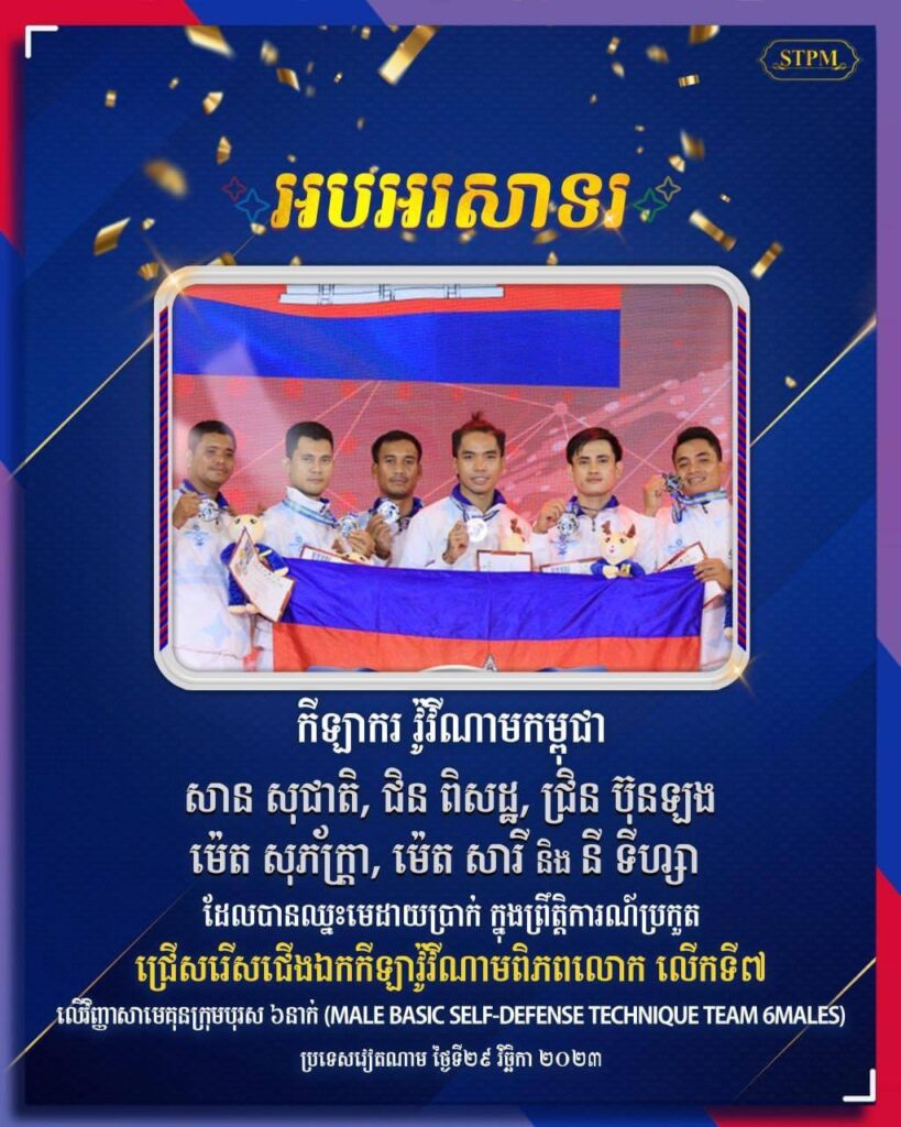 ក្នុងព្រឹត្តិការណ៍ប្រកួតជ្រើសរើសជើងឯកកីឡាវ៉ូវីណាមពិភពលោក លេីកទី៧ លើវិញ្ញាសាមេគុនក្រុមបុរស ៦នាក់ (MALE BASIC SELF-DEFENSE TECHNIQUE TEAM 6MALES)
