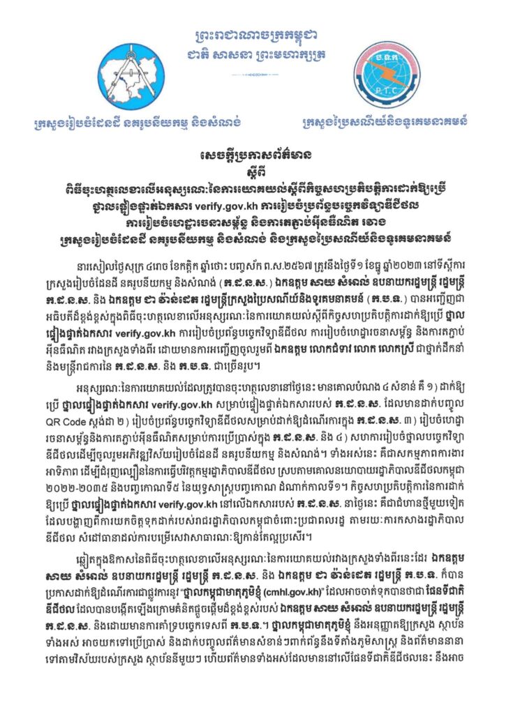 ក្រសួងរៀបចំដែនដី និងក្រសួងប្រៃសណីយ៍ ចុះអនុស្សរណៈ យោគយល់គ្នាលើកិច្ចសហប្រតិបត្តិការដាក់ឱ្យប្រើថ្នាលផ្ទៀងផ្ទាត់ឯកសារ ការរៀបចំប្រព័ន្ធបច្ចេកវិទ្យាឌីជីថល ការរៀបចំហេដ្ឋារចនាសម្ព័ន្ធ និងការតភ្ជាប់អ៊ីនធឺណិត