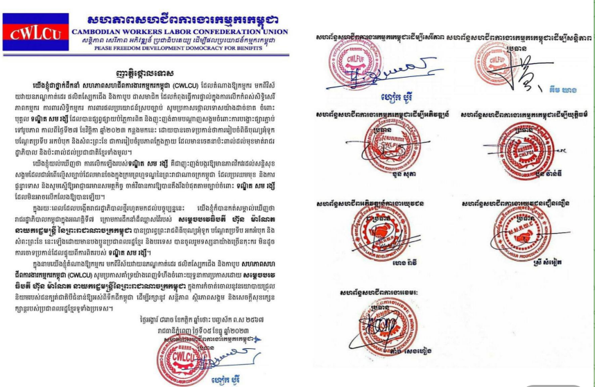 ក្នុងនាមតំណាងឱ្យកម្មករ មកពីវិស័យវាយនភណ្ឌកាត់ដេរ ផលិតស្បែកជើង និងកាបូប សហភាពសហជីពការងារកម្មករកម្ពុជា (CWLCU) សូមប្រកាសគាំទ្រយ៉ាងពេញទំហឹងចំពោះយុទ្ធនាការប្រកាសដោយសម្ដេចបរវធិបតី ហ៊ុន ម៉ាណែត នាយករដ្ឋមន្ត្រីនៃព្រះរាជាណាចក្រកម្ពុជា ក្នុងការកម្ចាត់ចោលនូវនយោបាយជ្រុលនិយមរបស់ជនក្បត់ជាតិបីជំនាន់ឱ្យអស់ពីទឹកដីកម្ពុជា ដើម្បីរក្សានូវសន្តិភាព ស្ថិរភាពសង្គម និងសេចក្តីសុខក្សេមក្សាន្តរបស់ប្រជាពលរដ្ឋខ្មែរទូទាំងប្រទេស៕