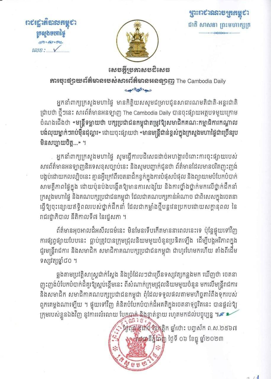 អ្នកនាំពាក្យក្រសួងមហាផ្ទៃបានធ្វើការបដិសេធដាច់អហង្ការចំពោះការចុះផ្សាយរបស់សារព័ត៌មានអនឡាញនិរទេសខុសច្បាប់នេះ និងសូមបញ្ជាក់ជូនថា ព័ត៌មានដែលមានចរិតញុះញង់ បង្កប់ដោយកលល្បិចនេះ គ្មានអ្វីក្រៅពីចេតនាដ៏កខ្វក់ក្នុងការបំផុសបំផុល និងព្យាយាមបំបែកបំបាក់ សាមគ្គីភាពផ្ទៃក្នុង ដោយប៉ុនប៉ងបង្កើតឱ្យមានការសង្ស័យ និងការថ្នាំងថ្នាក់មកលើថ្នាក់ដឹកនាំក្រសួងមហាផ្ទៃ និងគណបក្សប្រជាជនកម្ពុជា ដែលជាគណបក្សកាន់អំណាច ជាពិសេសក្នុងចេតនា ធ្វើឱ្យចុះខ្សោយឥទ្ធិពលរបស់ថ្នាក់ដឹកនាំ ដែលជាកម្លាំងថ្មីបន្តវេនប្រកបដោយសក្តានុពល នៃរាជរដ្ឋាភិបាល នីតិកាលទី៧ នៃរដ្ឋសភា។