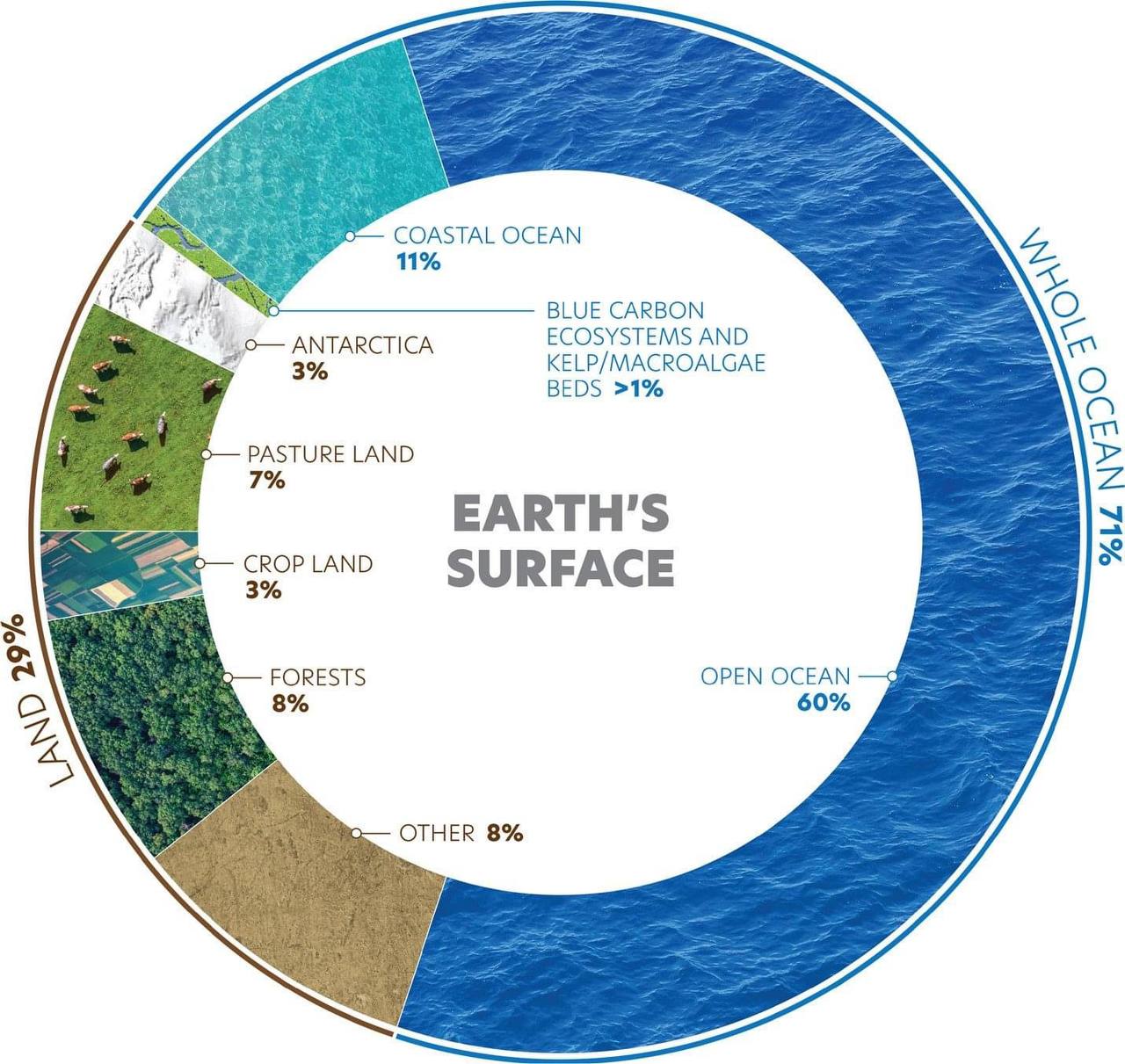 មានផ្ទៃមហាសមុទ្រទាំងមូល ៧១% និងផ្ទៃដី ២៩% ក្នុងនោះលំហសមុទ្រ ៦០% ឆ្នេរសមុទ្រ ១១% ប្រព័ន្ធអេកូកាបូនពណ៌ខៀវ (ឧ. ផ្ទៃដីកោងកាង និងស្មៅសមុទ្រ) តិចជាង ១% ផ្ទៃទឹកកកអង់តាក់ទិក ៣% ដីចិញ្ចឹមសត្វ ៧% ដីដាំដុះ ៣% ព្រៃឈើ ៨% និងផ្សេងៗទៀត ៨%។