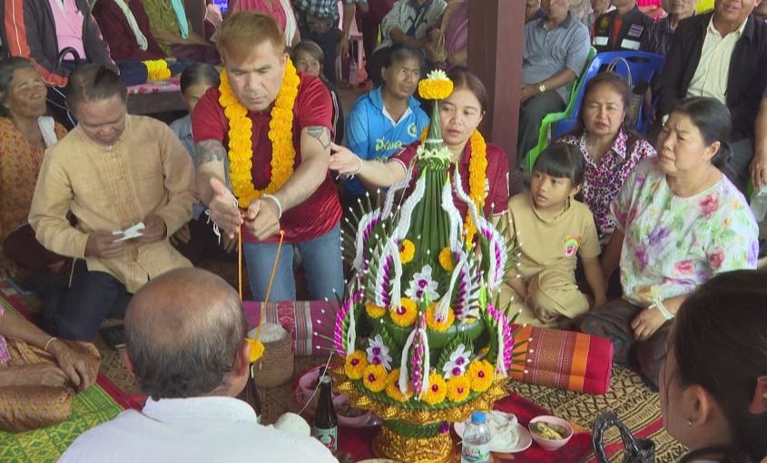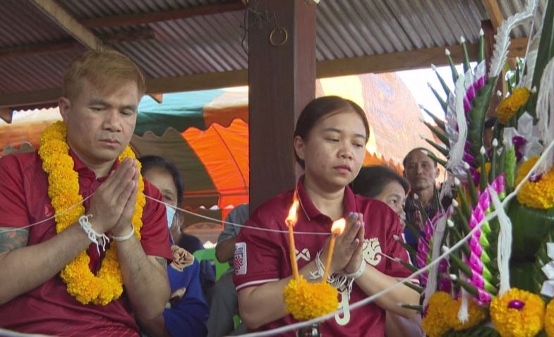 មនុស្សប្រហែល៥០ នាក់ រួមទាំងមន្ត្រីក្នុងតំបន់បានប្រមូលផ្តុំគ្នា កាលពីថ្ងៃពុធ សប្តាហ៍នេះ រៀបចំពិធីប្រពៃណី “Bai Sri Su Kwan” នៅក្នុងផ្ទះរបស់ប្តីប្រពន្ធនេះ នៅក្នុងភូមិតូចមួយនៅខេត្ត Udon Thani ភាគឦសានរបស់ប្រទេស។ កដៃរបស់ពួកគេត្រូវបានចងដោយខ្សែពណ៌ស ដើម្បីនាំសំណាងឱ្យពួកគេ មានសុខភាពល្អ។