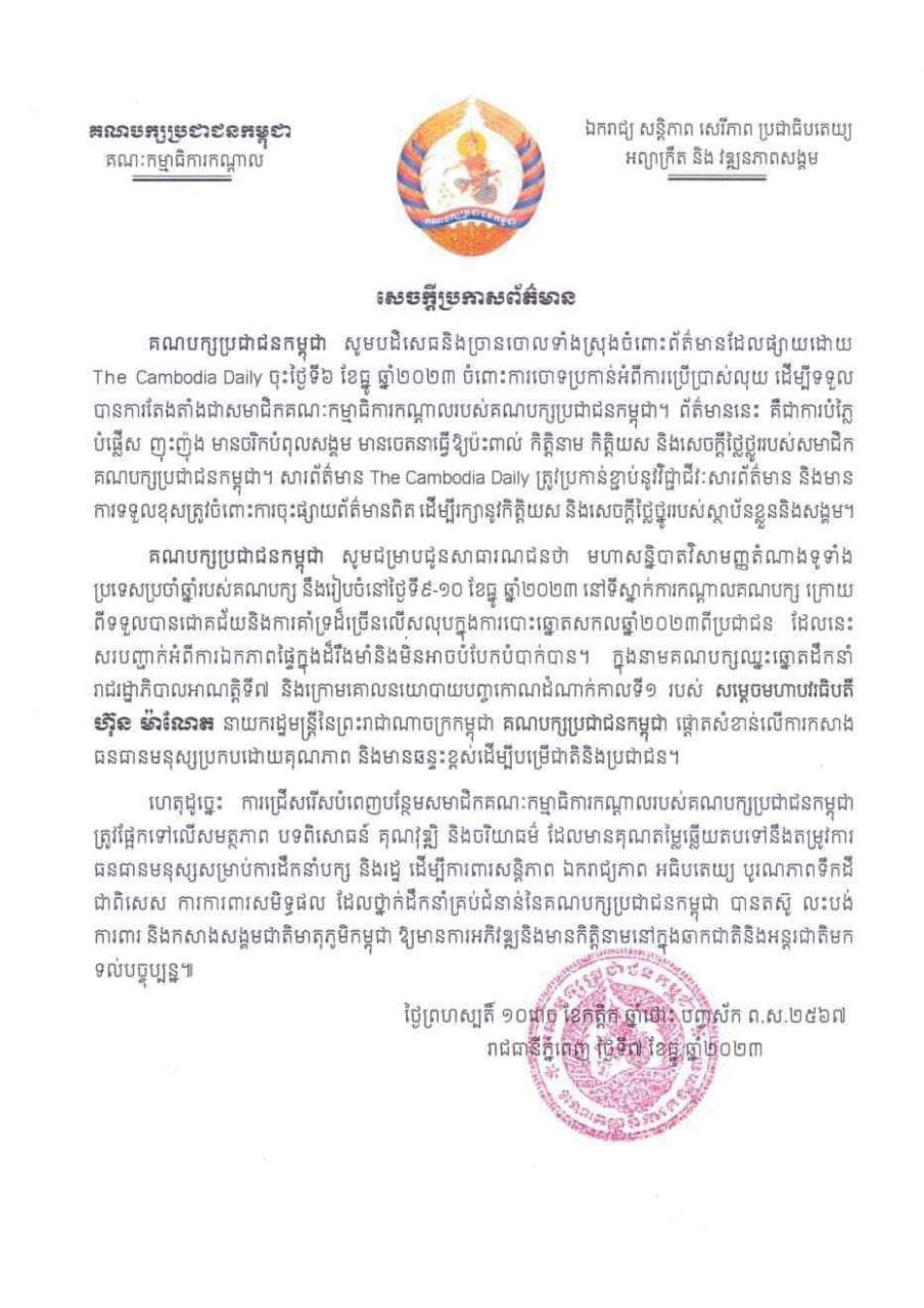 គណបក្សប្រជាជនកម្ពុជា បដិសេធនិងច្រានចោលទាំងស្រុងចំពោះព័ត៌មានដែលផ្សាយដោយ The Cambodia Daily ចុះថ្ងៃទី៦ ខែធ្នូ ឆ្នាំ២០២៣ ចំពោះការចោទប្រកាន់អំពីការប្រើប្រាស់លុយ ដើម្បីទទួលបានការតែងតាំងជាសមាជិកគណៈកម្មាធិការកណ្តាលរបស់គណបក្សប្រជាជនកម្ពុជា។ ព័ត៌មាននេះ គឺជាការបំភ្លៃ បំផ្លើស ញុះញ៉ង មានចរិតបំពុលសង្គម មានចេតនាធ្វើឱ្យប៉ះពាល់ កិត្តិនាម កិត្តិយស និងសេចក្ដីថ្លៃថ្នូររបស់សមាជិក គណបក្សប្រជាជនកម្ពុជា។ សារព័ត៌មាន The Cambodia Daily ត្រូវប្រកាន់ខ្ជាប់នូវវិជ្ជាជីវៈសារព័ត៌មាន និងមានការទទួលខុសត្រូវចំពោះការចុះផ្សាយព័ត៌មានពិត ដើម្បីរក្សានូវកិត្តិយស និងសេចក្តីថ្លៃថ្នូររបស់ស្ថាប័នខ្លួននិងសង្គម។