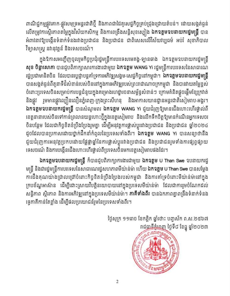 ក្នុងឱកាសអញ្ជើញចូលរួមកិច្ចប្រជុំរដ្ឋមន្ត្រីការបរទេសមេគង្គ-ឡានឆាង ឯកឧត្ដមឧបនាយករដ្ឋមន្តី សុខ ចិន្តាសោភា បានជួបពិភាក្សាសារការងារជាមួយ ឯកឧត្តម WANG Yi រដ្ឋមន្ត្រីការបរទេសនៃសាធារណ រដ្ឋប្រជាមានិតចិន ដែលបានប្ដេជ្ញាបន្តគាំទ្រការអភិវឌ្ឍសង្គម-សេដ្ឋកិច្ចនៅកម្ពុជា។ ឯកឧត្តមឧបនាយករដ្ឋមន្តី្រ បានសង្កត់ធ្ងន់ពីតួនាទីដ៏សំខាន់របស់ចិននៅក្នុងការអភិវឌ្ឍរបស់ព្រះរាជាណាចក្រកម្ពុជា និងបានវាយតម្លៃខ្ពស់ ចំពោះប្រទេសចិនសម្រាប់ការបន្តជំនួយក្នុងគម្រោងហេដ្ឋារចនាសម្ព័ន្ធសំខាន់ៗ ក្រោមគំនិតផ្តួចផ្ដើមខ្សែក្រវាត់ និងផ្លូវ រួមមានផ្លូវល្បឿនលឿនភ្នំពេញ-ក្រុងព្រះសីហនុ និងអាកាសយានដ្ឋានអន្តរជាតិសៀមរាប-អង្គរ។ ឯកឧត្តមឧបនាយករដ្ឋមន្ត្រី បានសំណូមពរ ឯកឧត្តម WANG Yi ជួយជំរុញឱ្យមានជើងហោះហើរផ្ទាល់ពីខេត្តនានារបស់ចិនទៅកាន់ព្រលានយន្តហោះថ្មីក្នុងខេត្តសៀមរាប និងលើកទឹកចិត្តឱ្យមានកំណើនអ្នកទេសចរចិនបន្ថែម ដែលជាកិច្ចខិតខំប្រឹងប្រែងរួមគ្នា ដើម្បីអនុវត្តការផ្លាស់ប្ដូររវាងប្រជាជន និងប្រជាជន ឆ្នាំ២០២៤ ដូចដែលបានប្រកាសដោយថ្នាក់ដឹកនាំកំពូលនៃប្រទេសទាំងពីរ។ ឯកឧត្តម WANG Yi បានសន្យាថានឹង ជួយជំរុញការអនុវត្តប្រកបដោយផ្លែផ្កាឆ្នាំនៃការផ្លាស់ប្តូររវាងប្រជាជន និងប្រជាជនរួមទាំងការផ្សព្វផ្សាយទេសចរណ៍ និងការបង្កើនជើងហោះហើរផ្ទាល់ពីប្រទេសចិនមកខេត្តសៀមរាបផងដែរ។