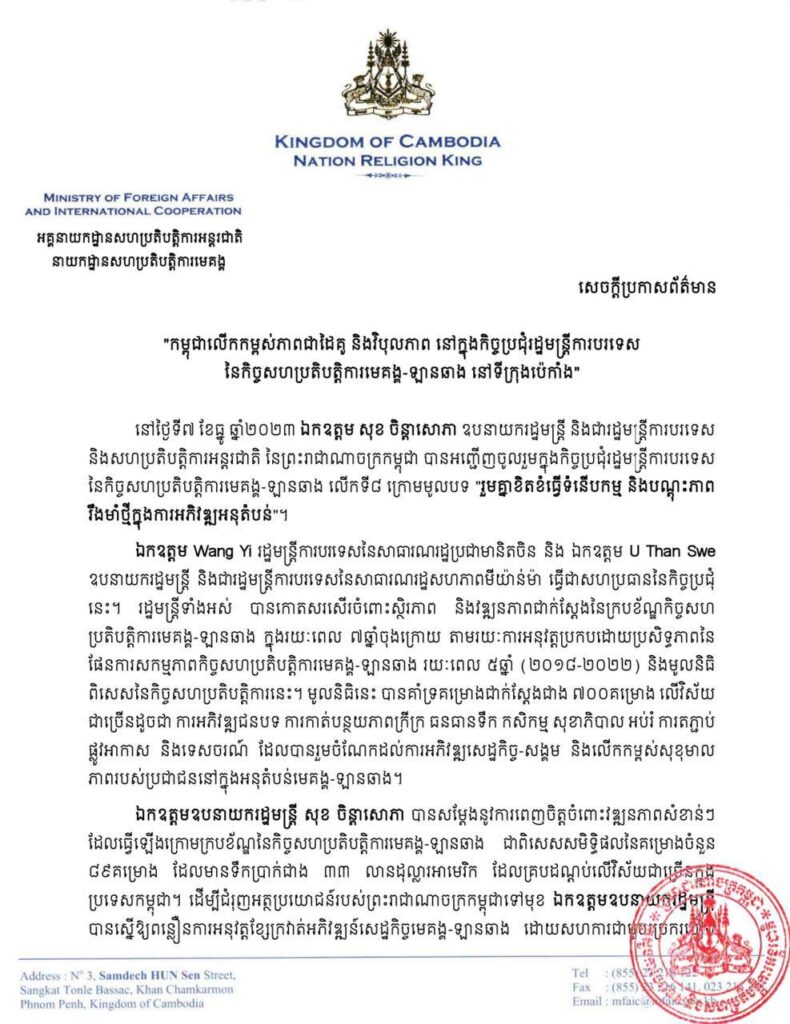 កម្ពុជាលើកកម្ពស់ភាពជាដៃគូ និងវិបុលភាព នៅក្នុងកិច្ចប្រជុំរដ្ឋមន្ត្រីការបរទេស នៃកិច្ចសហប្រតិបត្តិការមេគង្គ-ឡានឆាង នៅទីក្រុងប៉េកាំង