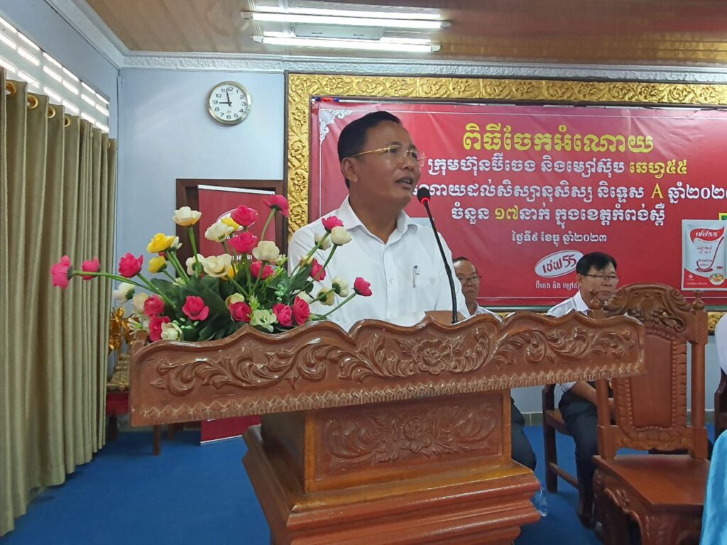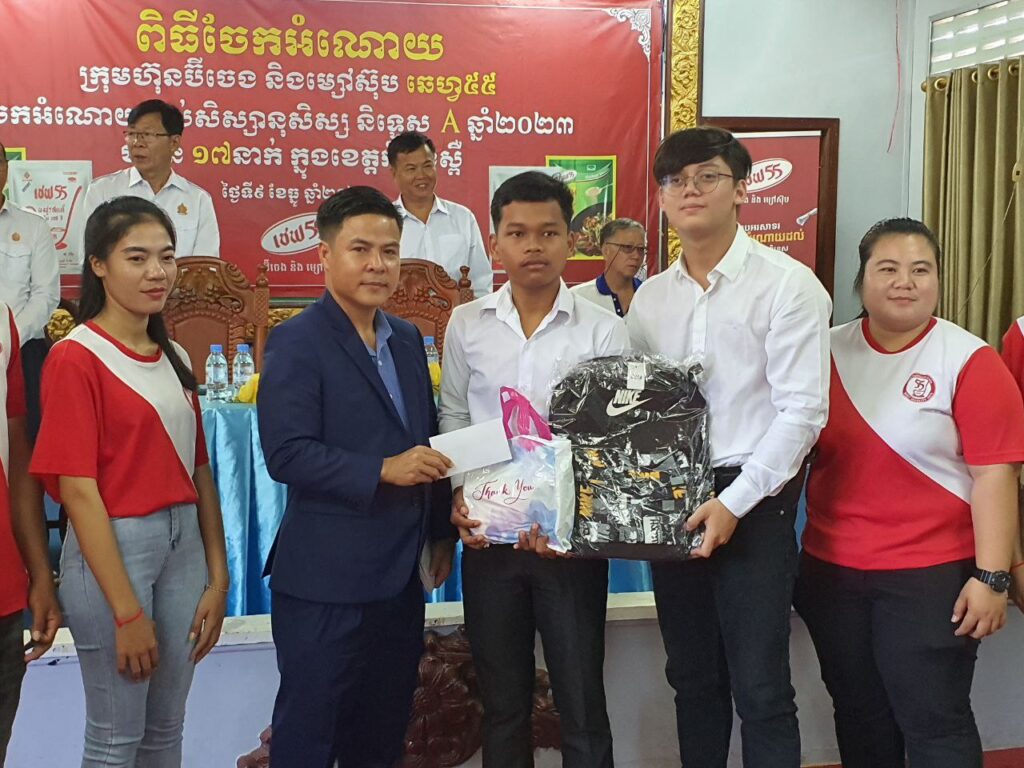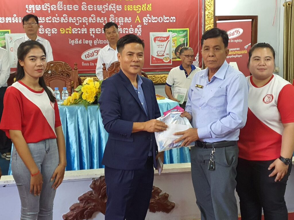 ក្នុងនាមនាយកក្រុមហ៊ុន ប៊ីចេង និងម្សៅស៊ុបឆេហ្វ៥៥ ទាំងមូលបាននាំយកនូវថវិកាជូនដល់ប្រធានមន្ទីរអប់រំចំនួន ៤០ម៉ឺនរៀល លោកនាយក-នាយករង លោកគ្រូ-អ្នកគ្រូ ចំនួន ១៥ម៉ឺនរៀលក្នុងម្នាក់ សិស្សនិទ្ទេសA ចំនួន ៥៥ម៉ឺនរៀលក្នុងម្នាក់ និងកាដូដែលសរុបទឹកប្រាក់រួម ចំនួន ១៣លាន ២២ម៉ឺន ១០០០រៀល ៕