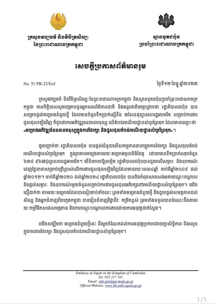 ភ្នំពេញ៖ រដ្ឋាភិបាលជប៉ុន បានសម្រេចផ្តល់គម្រោងជំនួយថ្មី ដែលមានចំនួនទឹកប្រាក់ស្មើនឹង ៣សែនដុល្លារអាមេរិក សម្រាប់ការងារជួសជុលឡើងវិញ ក៏ដូចជាការអភិវឌ្ឍធនធានមនុស្ស លើតំបន់រមណីយដ្ឋានសំបូរព្រៃគុក ដែលមានឈ្មោះថា «គម្រោងអភិវឌ្ឍន៍ធនធានមនុស្សក្នុងការថែរក្សា និងជួសជុលតំបន់រមណីយដ្ឋានសំបូរព្រៃគុក»។
