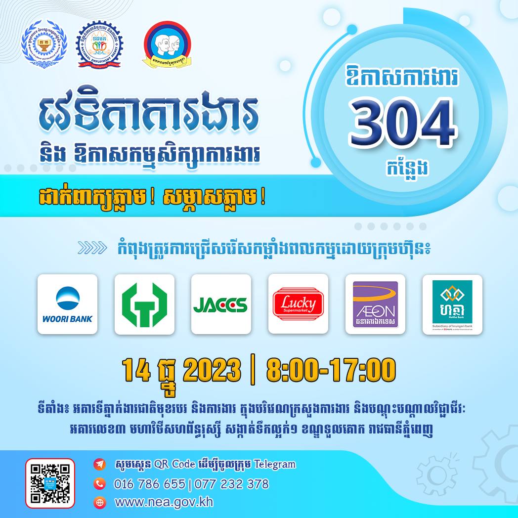 ប្រភពពីទីភ្នាក់ងារជាតិមុខរបរ និងការងារ(NEA)នៅថ្ងៃទី ១២ ខែធ្នូ ឆ្នាំ ២០២៣នេះបានឱ្យដឹងថា៖ចំពោះសិស្ស/និស្សិត និងអ្នកកំពុងតែស្វែងរកការងារ ធ្វើ ឬចង់ផ្លាស់ប្តូរការងារអាចយកប្រវត្តិរូបសង្ខេប (CV) ដើម្បីចូលរួមដាក់ពាក្យ និងសម្ភាសផ្ទាល់ជាមួយ អ្នកតំណាងក្រុមហ៊ុនទាំងនោះបាន ចាប់ពីម៉ោង ៨:០០ព្រឹក ដល់ម៉ោង ០៥:០០ល្ងាច នៅក្នុងបរិវេណក្រសួងការងារ និងបណ្តុះបណ្តាលវិជ្ជាជីវៈនៅថ្ងៃទី១៤ ខែធ្នូ ឆ្នាំ២០២៣។