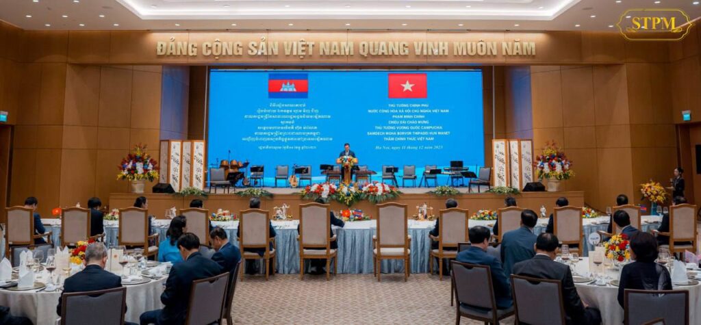 សូមជម្រាបថា ក្នុងពិធីលៀងសាយភោជន៍ស្វាគមន៍ ដំណើរ ទស្សនកិច្ចជាផ្លូវការនៅក្នុងប្រទេសវៀតណាម ដែលរៀបចំ ដោយឯកឧត្តម ផាម មិញជិញ នាយករដ្ឋមន្ត្រីវៀតណាម នៅយប់ថ្ងៃទី១១ ខែធ្នូ នាទីក្រុងហាណូយ សាធារណរដ្ឋ សង្គម និយមវៀតណាម សម្តេចធិបតី ហ៊ុន ម៉ាណែត នាយករដ្ឋមន្ត្រីកម្ពុជា បានគូសបញ្ជាក់ថា កម្ពុជា និង វៀតណាម មិនត្រឹមតែបានសម្រេច នូវគោលដៅពាណិជ្ជកម្ម ៥ប៊ីលានដុល្លារអាមេរិក ក្នុងឆ្នាំ២០២០ប៉ុណ្ណោះទេ ថែមទាំង បានកើនឡើងឈានដល់ជិត ១១ប៊ីលានដុល្លារ ក្នុងឆ្នាំ ២០២២ ។ ជាមួយគ្នានេះ សម្ដេចធិបតី និងឯកឧត្តម ផាម មិញជិញ ក៏បានដាក់គោលដៅ ពាណិជ្ជកម្មទ្វេភាគី ឈានដល់ សម្រេចបាន ២០ប៊ីលានដុល្លារ ក្នុងរយៈពេលខ្លីខាងមុខ ។