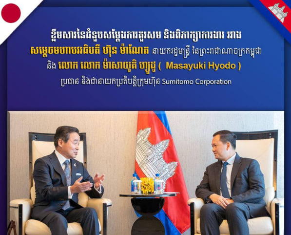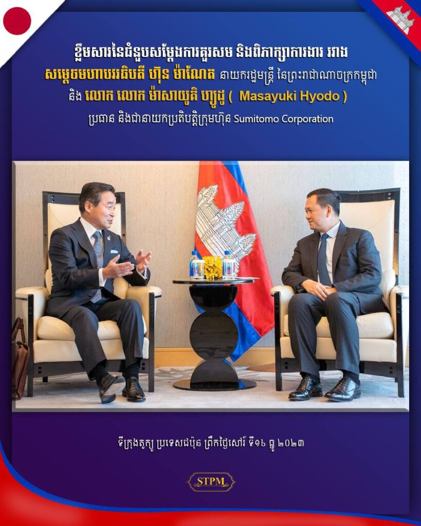នាយកប្រតិបត្តិក្រុមហ៊ុន Sumitomo Corporation លោក Masayuki Hyodo ក៏បានជម្រាបជូនសម្តេចធិបតី អំពីសកម្មភាពវិនិយោគរបស់ក្រុមហ៊ុនទាំងនៅក្នុងប្រទេសកម្ពុជា និងតំបន់អាស៊ាន លើវិស័យជាច្រើន រួមមាន៖ ការផលិតបរិក្ខារអេឡិចត្រូនិក ថាមពល ហេដ្ឋារចនាសម្ព័ន្ធ ការផ្សព្វផ្សាយ និងឌីជីថល។