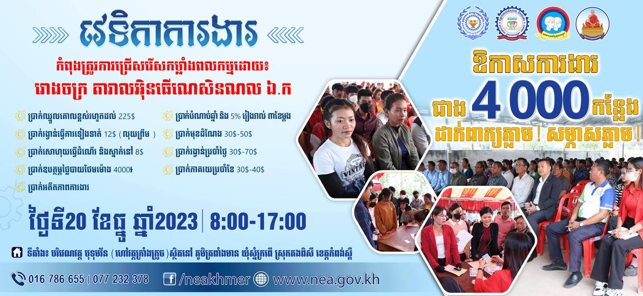 ប្រភពពីទីភ្នាក់ងារជាតិមុខរបរ និងការងារនៅថ្ងៃទី ១៨ ខែ ធ្នូ ឆ្នាំ ២០២៣ នេះ បានឱ្យដឹងថា៖” ចំពោះយុវជន និងអ្នកកំពុងស្វែង រកការងារធ្វើ ឬចង់ផ្លាស់ប្តូរការងារ អាចត្រៀមប្រវត្តិរូប ដើម្បី ចូល រួមដាក់ពាក្យ និងសម្ភាសផ្ទាល់ជាមួយនឹងតំណាងរោងចក្របាន ចាប់ពីម៉ោង ៨:០០ព្រឹក ដល់ម៉ោង ១៧:០០ នៅថ្ងៃទី២០ ខែធ្នូ ឆ្នាំ២០២៣”។