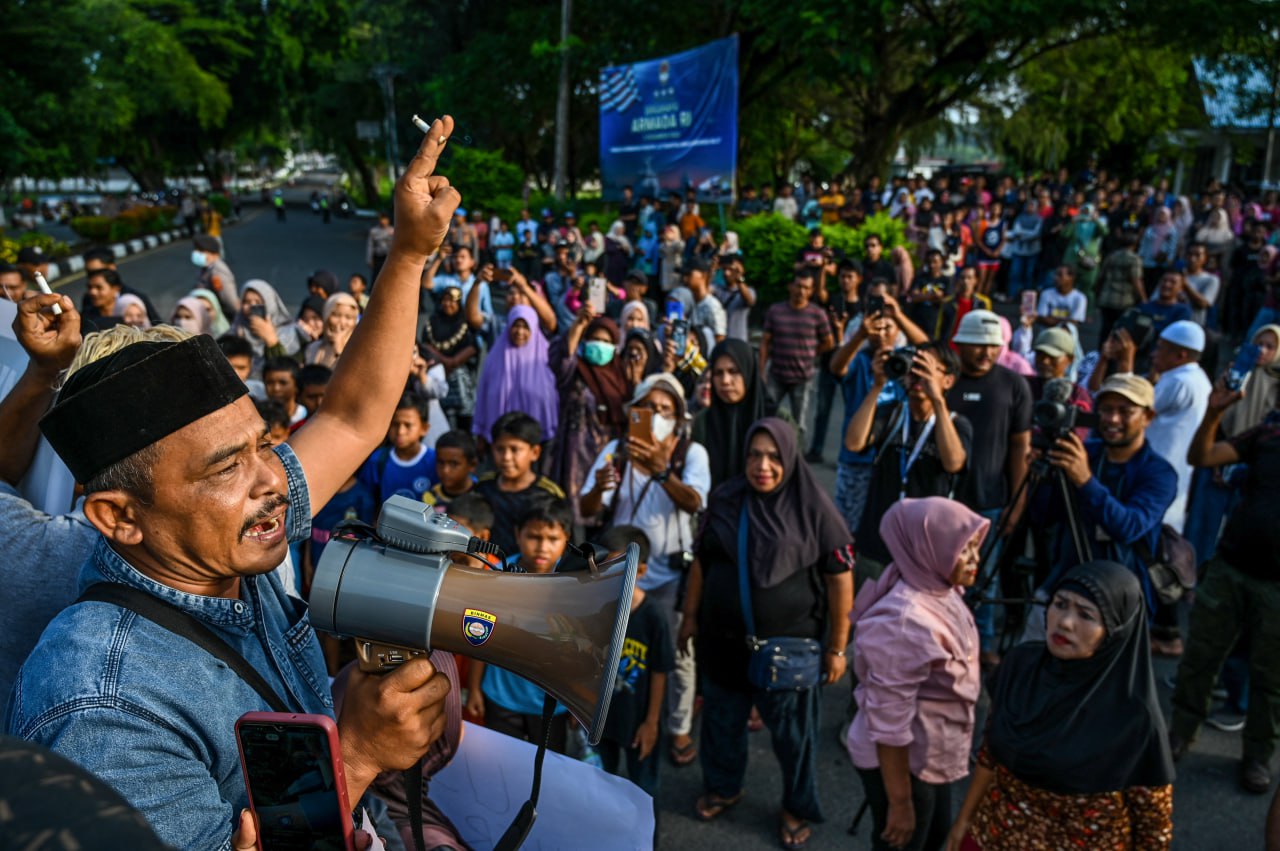 ហ្សារកាតា៖ មនុស្សរាប់រយនាក់ប្រមូលផ្តុំគ្នាធ្វើបាតុកម្ម ប្រឆាំងនឹងវត្តមានជនភៀសខ្លួនរ៉ូហ៊ីងយ៉ា និងភ្នាក់ងារផ្តល់ជំនួយដល់ក្រុមជនជាតិភាគតិច នៅខាងក្រៅជំរុំមួយនៅលើកោះសាបាង ក្នុងខេត្តអាឆេ ប្រទេសឥណ្ឌូនេស៊ី។