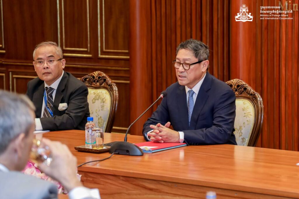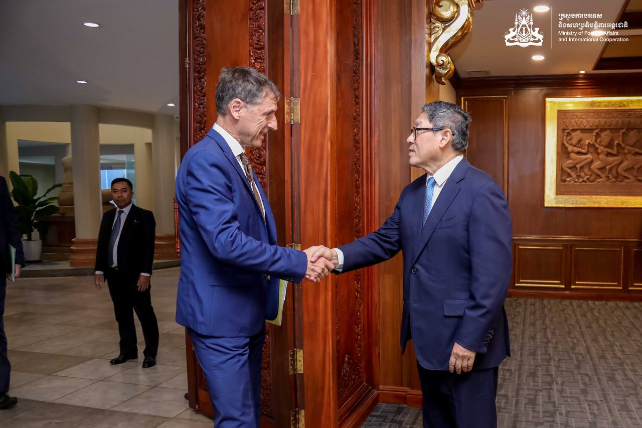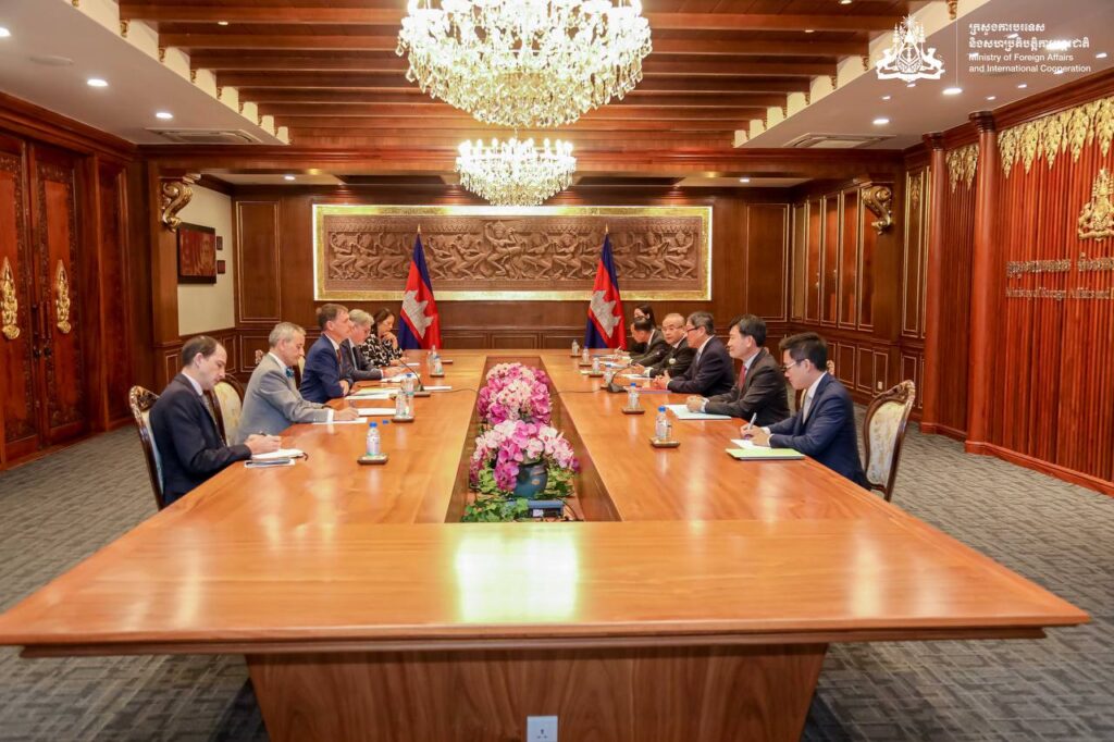 ភ្នំពេញ៖ រដ្ឋមន្ត្រីការបរទេស និងសហប្រតិបត្តិការអន្តរជាតិ ឯកឧត្តម ឧបនាយករដ្ឋមន្ត្រី សុខ ចិន្តាសោភា និងឯកអគ្គរដ្ឋទូតបារាំងប្រចាំព្រះរាជាណាចក្រកម្ពុជា ឯកឧត្តម Jacques PELLET បានអះអាងជាថ្មីនូវការប្តេជ្ញាចិត្តក្នុងការលើកកម្ពស់បន្ថែមទៀតនូវទំនាក់ទំនងរវាងប្រទេសទាំងពីរ តាមរយៈការផ្លាស់ប្តូរទស្សនកិច្ចកម្រិតខ្ពស់បន្ថែមទៀត។ ការប្តេជ្ញាចិត្តរបស់ភាគីទាំងពីរ បានធ្វើឡើងនៅក្នុងជំនួបពិភាក្សាការងារ នៅទីស្តីការក្រសួងការបរទេស និងសហប្រតិបត្តិការអន្តរជាតិ នៅថ្ងៃទី២២ ខែធ្នូ ឆ្នាំ២០២៣។