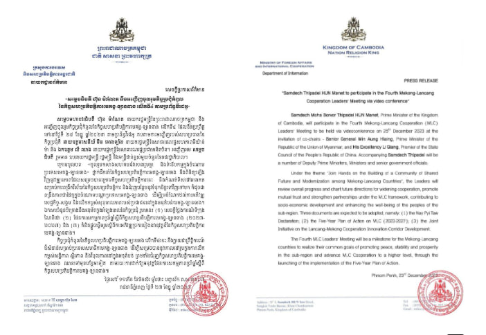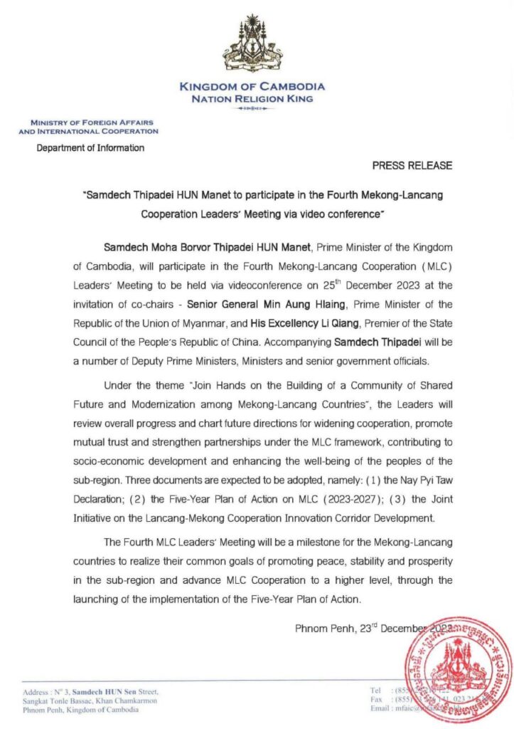 សេចក្តីប្រកាសព័ត៌មានរបស់ក្រសួងការបរទេស និងសហប្រតិបត្តិការអន្តរជាតិ ចុះថ្ងៃទី២៣ ខែធ្នូ ឆ្នាំ ២០២៣ បានឱ្យដឹងថា ការចូលកិច្ចប្រជុំនេះ តបតាមការអញ្ជើញរបស់សហប្រធាននៃកិច្ចប្រជុំគឺឯកឧត្តម មីន អោងឡាំង នាយករដ្ឋមន្ត្រីនៃសាធារណរដ្ឋសហភាពមីយ៉ាន់ម៉ា និងឯកឧត្តម លី ឈាង នាយករដ្ឋមន្ត្រីនៃសាធារណរដ្ឋប្រជាមានិតចិន។ កិច្ចប្រជុំនេះ នឹងប្រព្រឹត្តទៅនៅថ្ងៃទី ២៥ ខែធ្នូ ឆ្នាំ២០២៣ ដែលនឹងមានឧបនាយករដ្ឋមន្ត្រី រដ្ឋមន្ត្រី និងមន្ត្រីជាន់ខ្ពស់មួយចំនួននៃរាជរដ្ឋាភិបាលកម្ពុជា អញ្ជើញអមសម្ដេចធិបតី ហ៊ុន ម៉ាណែត នាយករដ្ឋមន្រ្តីកម្ពុជា ។