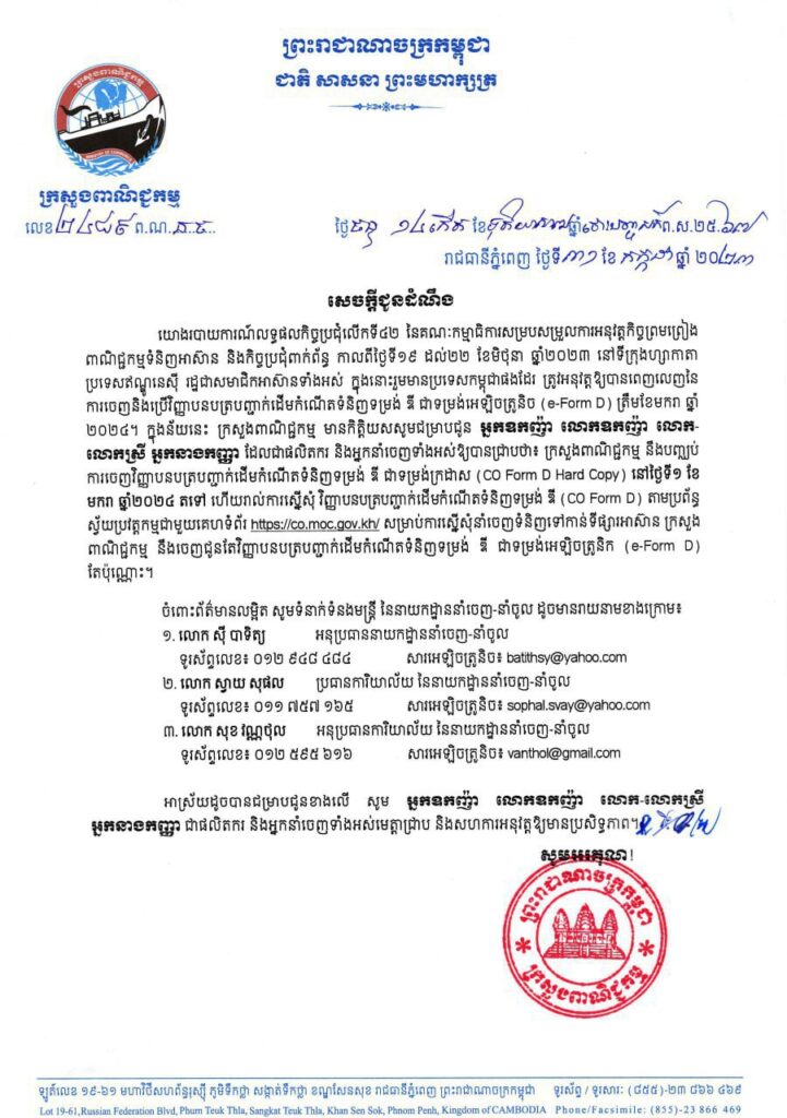 ភ្នំពេញ៖ ក្រសួងពាណិជ្ជកម្ម នឹង បញ្ឈប់ការចេញ វិញ្ញាបនបត្រ បញ្ញាក់ដើមកំណើតទំនិញទម្រង់ ឌី ជាទម្រង់ក្រដាស (C/O Form D Hard Copy) នៅថ្ងៃទី០១ ខែមករា ឆ្នាំ២០២៤ តទៅ ហើយរាល់ការស្នើសុំ វិញ្ញាបនបត្រ បញ្ជាក់ ដើមកំណើត ទំនិញទម្រង់ ឌី (C/O Form D) តាមប្រព័ន្ធស្វ័យប្រវត្តកម្មជាមួយគេហទំព័រ https://co.moc.gov.kh សម្រាប់ការស្នើសុំនាំចេញទំនិញទៅកាន់ទីផ្សារអាស៊ាន ក្រសួងពាណិជ្ជកម្មនឹង ចេញ ជូន តែ វិញ្ញាបនបត្រ បញ្ជាក់ដើមកំណើតទំនិញទម្រង់ ឌី ជាទម្រង់អេឡិចត្រូនិក (e-Form D) ប៉ុណ្ណោះ លើកលែងតែក្នុង ករណី ដាច់ ប្រព័ន្ធ ពុំអាច បញ្ជូន e-Form D នោះទៅដល់ប្រទេស គោលដៅ នេះបើយោងតាមសេចក្តីជូនដំណឹងរបស់ក្រសួងពាណិជ្ជកម្ម។