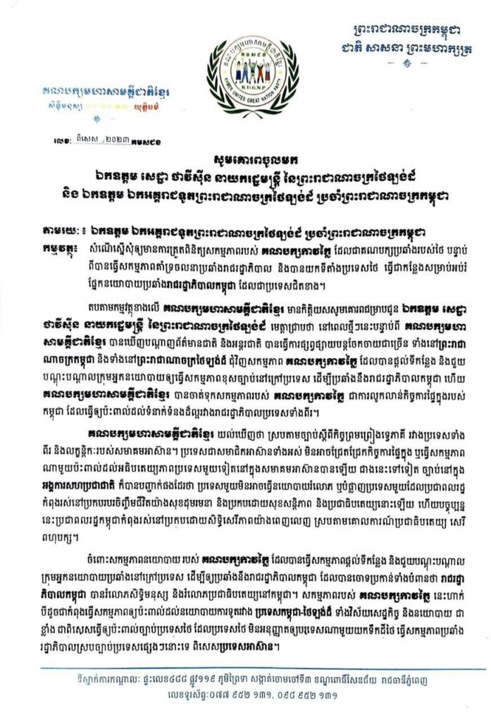 គណបក្សមហាសាមគ្គីជាតិខ្មែរ ធ្វើលិខិតស្នើនាយករដ្ឋមន្ត្រីថៃត្រួតពិនិត្យសកម្មភាពរបស់គណបក្សកាវក្លៃគាំទ្រចលនាប្រឆាំងរាជរដ្ឋាភិបាល និងបានយកទីតាំងប្រទេសថៃ ធ្វើជាកន្លែងសម្រាប់អប់រំផ្នែកនយោបាយប្រឆាំងរាជរដ្ឋាភិបាលកម្ពុជា