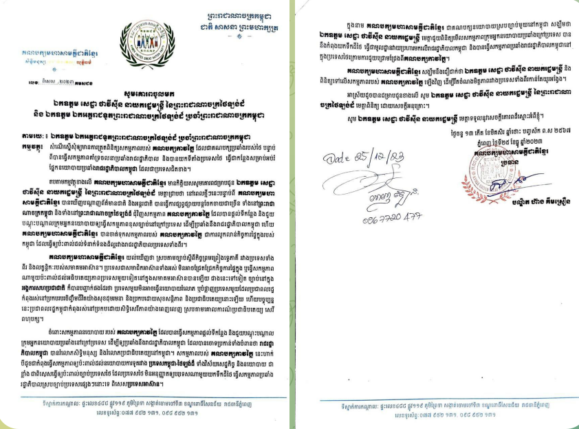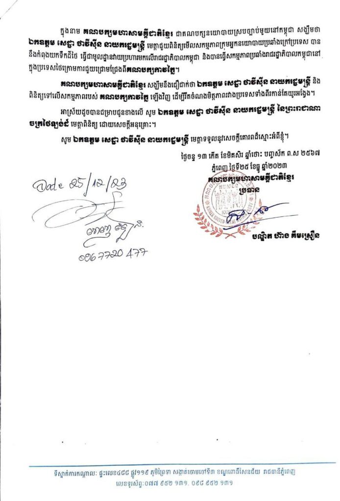 ភ្នំពេញ៖ គណបក្សមហាសាមគ្គីជាតិខ្មែរ បានធ្វើលិខិតឯកឧត្តម សេដ្ឋា ថាវីស៊ីន នាយករដ្ឋមន្ត្រី នៃព្រះរាជាណាចក្រថៃឡង់ដ៏ និងឯកឧត្តមឯកអគ្គរាជទូតព្រះរាជាណាចក្រថៃឡង់ដ៍ ប្រចាំព្រះរាជាណាចក្រកម្ពុជា ស្នើសុំឱ្យមានការត្រួតពិនិត្យសកម្មភាពរបស់គណបក្សកាវក្លៃ ដែលជាគណបក្សប្រឆាំងរបស់ថៃ បន្ទាប់ពីបានធ្វើសកម្មភាពគាំទ្រចលនាប្រឆាំងរាជរដ្ឋាភិបាល និងបានយកទីតាំងប្រទេសថៃ ធ្វើជាកន្លែងសម្រាប់អប់រំផ្នែកនយោបាយប្រឆាំងរាជរដ្ឋាភិបាលកម្ពុជា ដែលជាប្រទេសជិតខាង។ នេះបើយោងតាមលិខិតចុះថ្ងៃទី២៥ ខែធ្នូ ឆ្នាំ២០២៣ របស់លោក ហ៊ាង គឹមស្រឿន ប្រធានគណបក្សមហាសាគ្គីជាតិខ្មែរ។